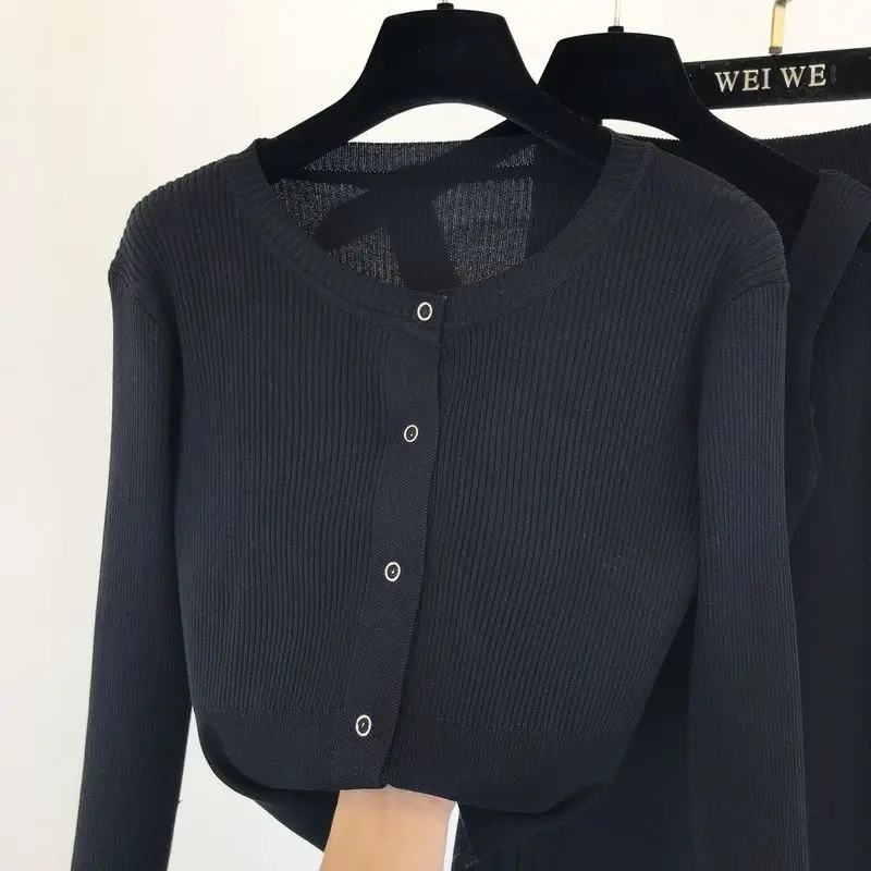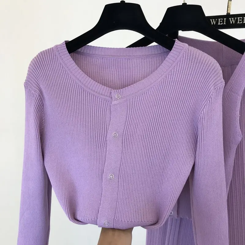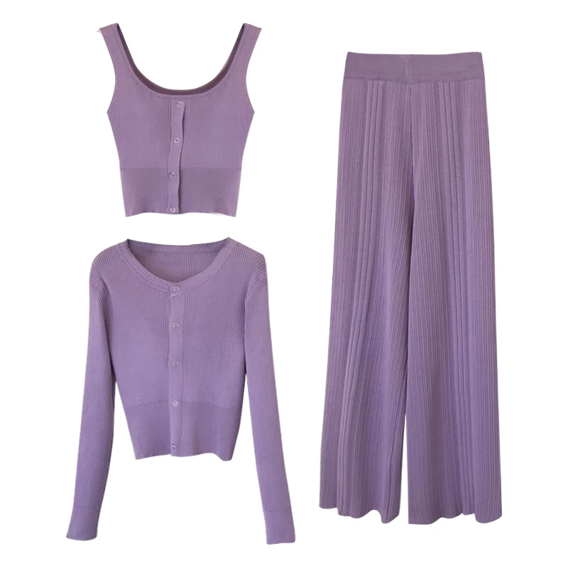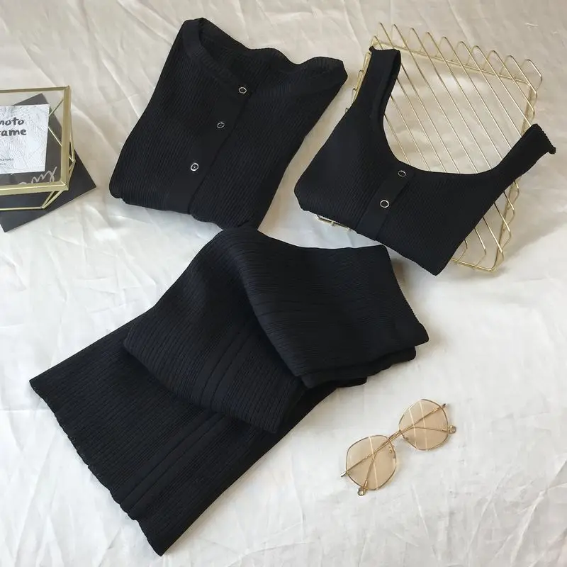 Осенние женские вязаные комплекты, модные однотонные однобортные костюмы, длинный кардиган с рукавами, камзол и широкие брюки, Женский комплект из 3 предметов