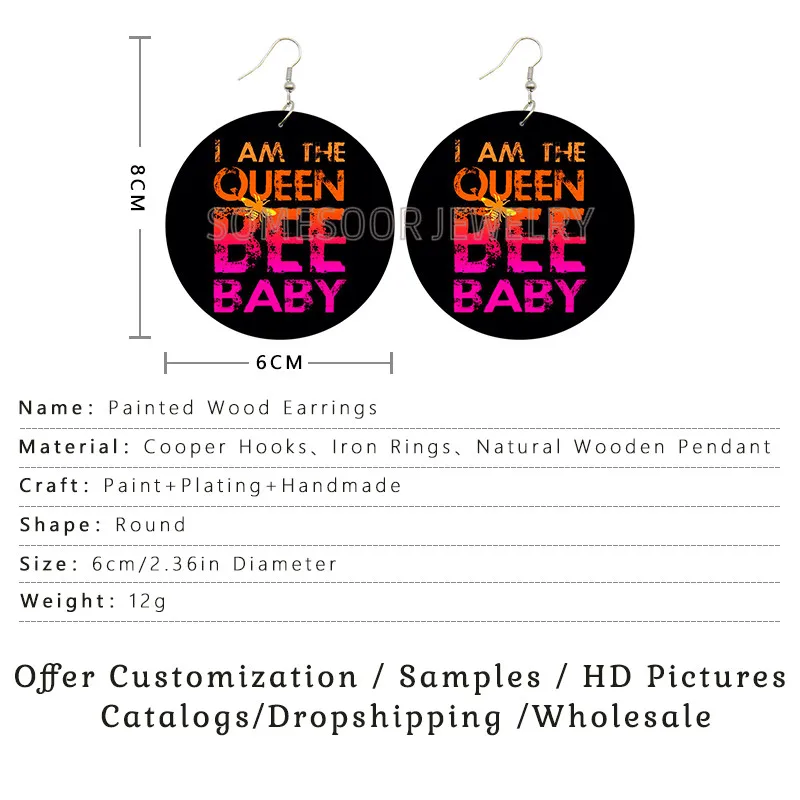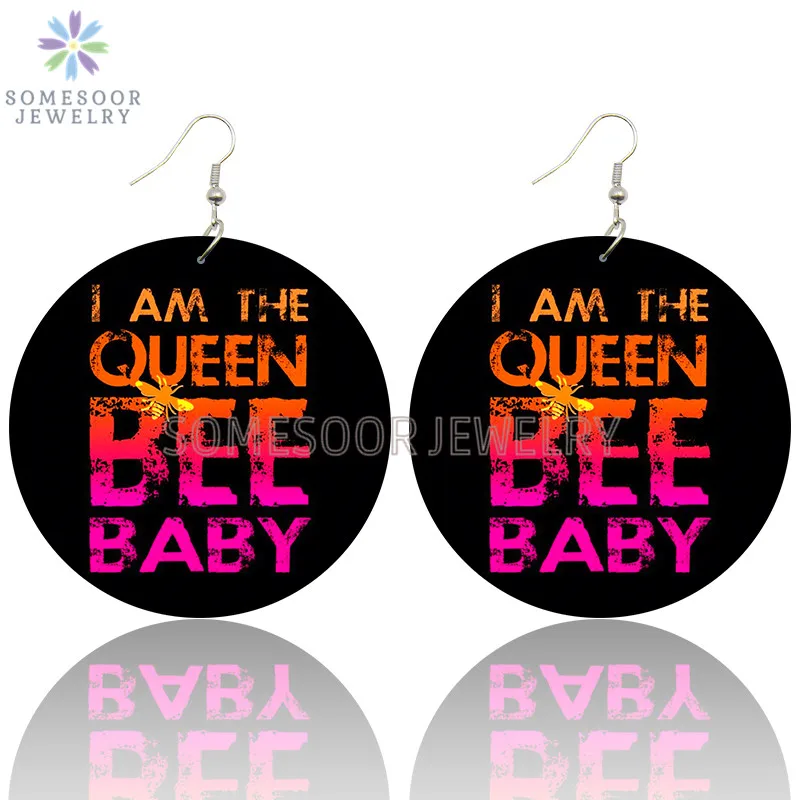 Деревянные детские серьги-подвески SOMESOOR с надписью Я королева пчела, образованные черные петли с рисунком, деревянная подвеска, ювелирные изделия для женщин Gi