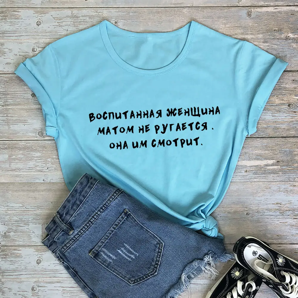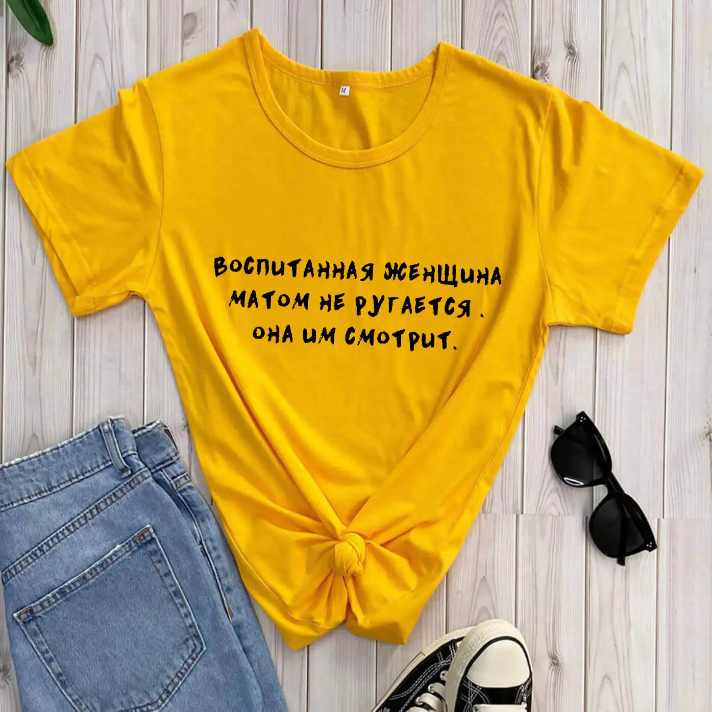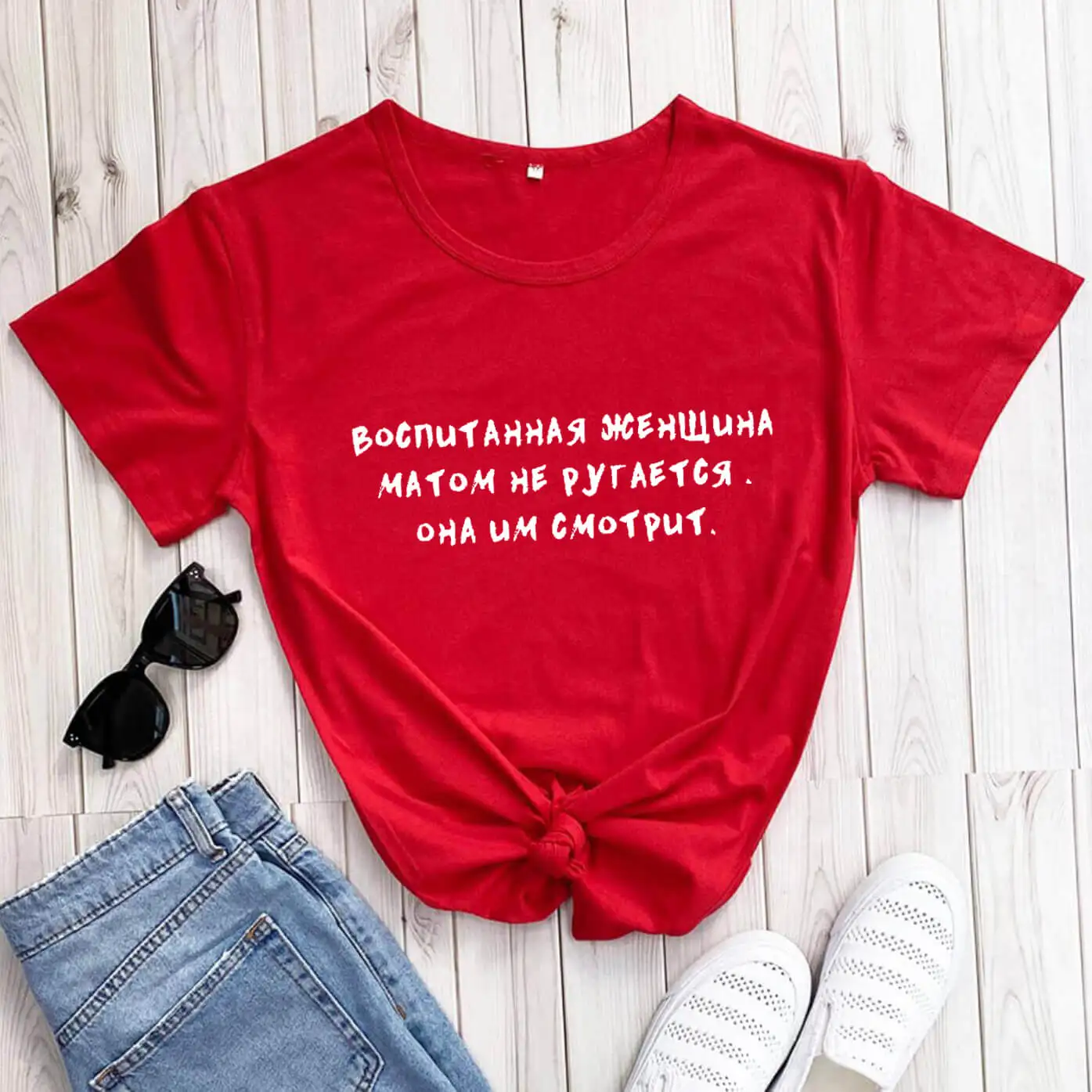 воспитанная женщина русских букв Новое поступление Повседневная забавная футболка из 100% хлопка модные женские топы Прямая поставка