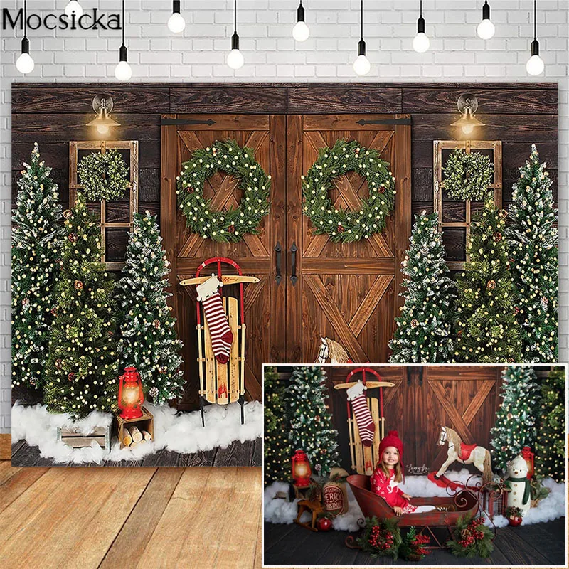 Рождественские фоны для фотосъемки темно-зеленые деревянные двери ф...