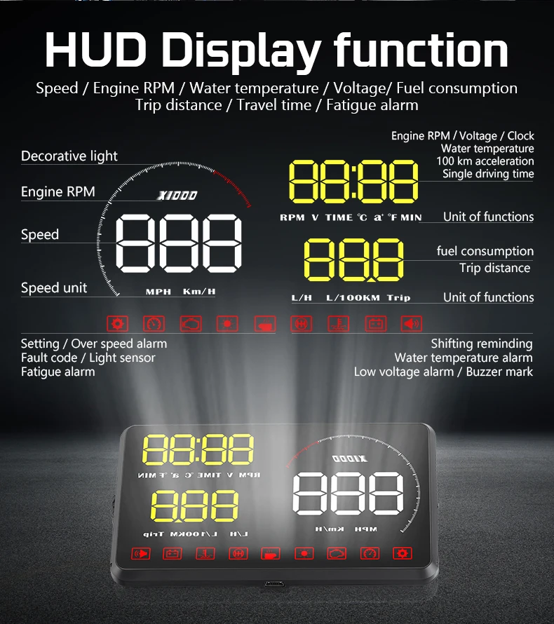 A9 HUD 5.5in Универсальный Автомобильный дисплей ODB2 система автомобильной диагностики Особенности: 1. 5.5in цветной экран, отражающее считывание, неразрушающая установка, подключи и работай. 2. Он может отображать скорость вождения, скорость двигателя, мгновенный расход топлива, средний расход топлива, часы, количество пройденных километров, это время вождения, 100 км время ускорения, может обнаруживать и очищать Код диагностики ошибки автомобиля, нет необходимости в профессиональном оборудовании для устранения. 3. Сигнализация с превышением скорости, сигнализация с температурой воды, напоминание о усталости вождения, сигнализация напряжения (можно установить свободно), раннее предупреждение о поломке автомобиля, безопаснее для использования. 4. Запуск с автомобилем, сон с автомобилем, эффективно защищает автомобильную батарею, сохраняя при этом ручной выключатель машины, более выгодно контролировать HUD. 5. Автоматическая регулировка яркости, сохранение функции ручной регулировки. Параметры: Состояние на 100% абсолютно новый Тип товара: HUD Дисплей Цвет: как на картинке Условия эксплуатации: температура окружающей среды: 40 ℃-+ 120 ℃ Атмосферные Давление: 86-106KPa Относительная влажность: 10% - 95% Шум окружающей среды: <= 60 дБ (A) Рабочее напряжение: 11 в-18 в постоянного тока (12 В постоянного тока/200 мА) Ток в режиме ожидания: <= 30 мА Режим отображения: режим отражения виртуального изображения Экран изображения: светодиодный дисплей Размер экрана: 5,5 дюймов OBD2 Применение диапазон: Американский протокол OBD2 бензиновый автомобиль, произведенный после 2004 года, Другой регион OBD2 протокол бензиновый автомобиль, произведенный после 2008 года. Не применимые модели в общих моделях: 1. Американская модель автомобиля для Dodge, для Jeep, для Sail, для Chrysler, Произведено в 2004 году и до 2004 года 2. Французская и итальянская модель для Fiat, для Maserati, для Lamborghini, для DS, для Peugeot, для Citroen, для Renault, для Simca, для Amilcar и т. д. 3. Японская модель для Suzuki, для Mazda 6, для Infiniti (QX50 q50 q501), для Toyota Avanza 2013, для Lexus (250, ex250, ES300H), и для Honda 4. Корейские части модели для Kia и HYUNDAI, такие как для HYUNDAI SONATA 2013, для Kia Soul PS 2017 и т. Д. 5. Бензиновый Электрический гибридный и дизельный автомобиль, пикап, туристический автомобиль, модифицированный автомобильный компьютерный автомобиль. Посылка список: 1 х хост 1 х кабель OBD 1 нескользящий коврик 1 х светоотражающая пленка Инструкция (1 шт.)