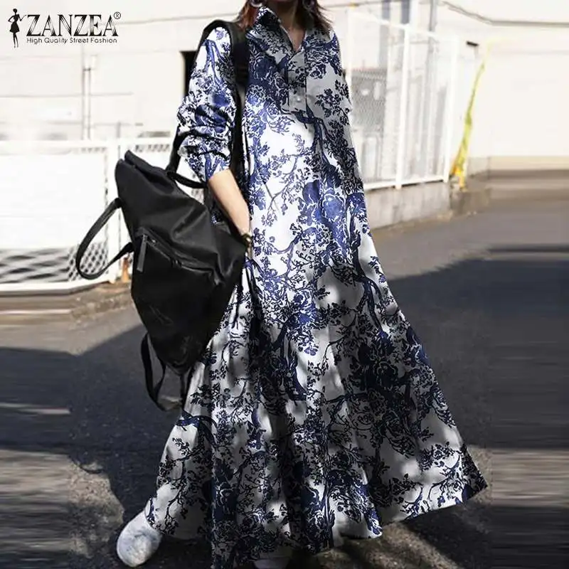 Платье ZANZEA женское Винтажное с цветочным принтом, Длинный свобод...