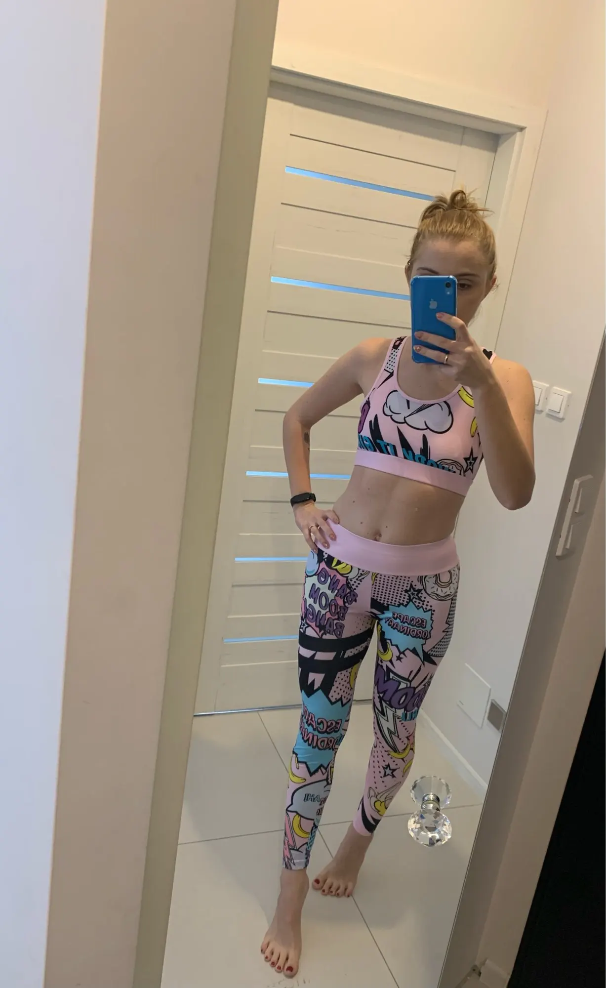 При выборе размера отдавайте предпочтение в большую сторону, т.е. если носите 42-44, то берите m. ткань не совсем как на спортивные тайтсы, но тянется, а главное не просвечивает, рисунок чёткий, яркий. при присяде сползают штаны, хотя и размер меньше, чем хотелось бы. на большую грудь лиф мал, зато бегать наверное удобно будет- прижимает хорошо. мне не подошёл размер, но мне продавец вернул часть денег, поэтому оценку не снижаю. для тех, кому сядет по фигуре- очень советую.