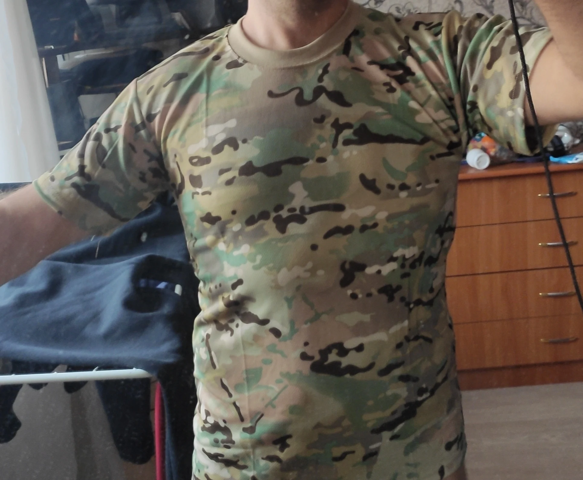 Качественная синтетическая футболка. Нитки не торчат. На мои 105 кг и 185 см роста впритык. Буду худеть. Продавца рекомендую.