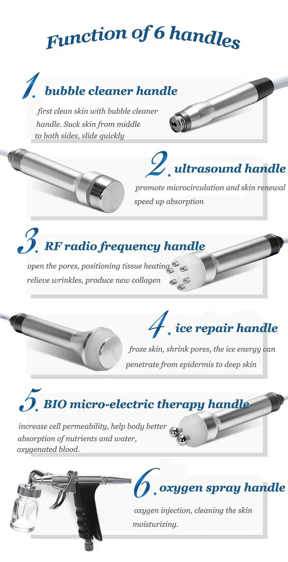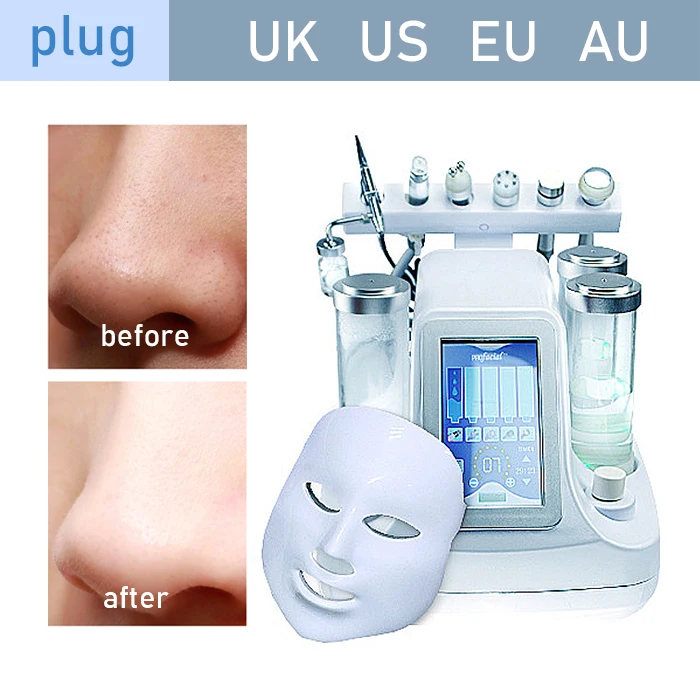 1х машина для красоты 1x семицветный светильник-маска 1x ручка для распыления кислорода 1x ручка для ремонта льда 1x ультразвуковая ручка 1x радиочастотная ручка 1x ручка для очистки пузырьков 1x био микро-электрическая терапия ручка 8x головки для очистки пузырьков
