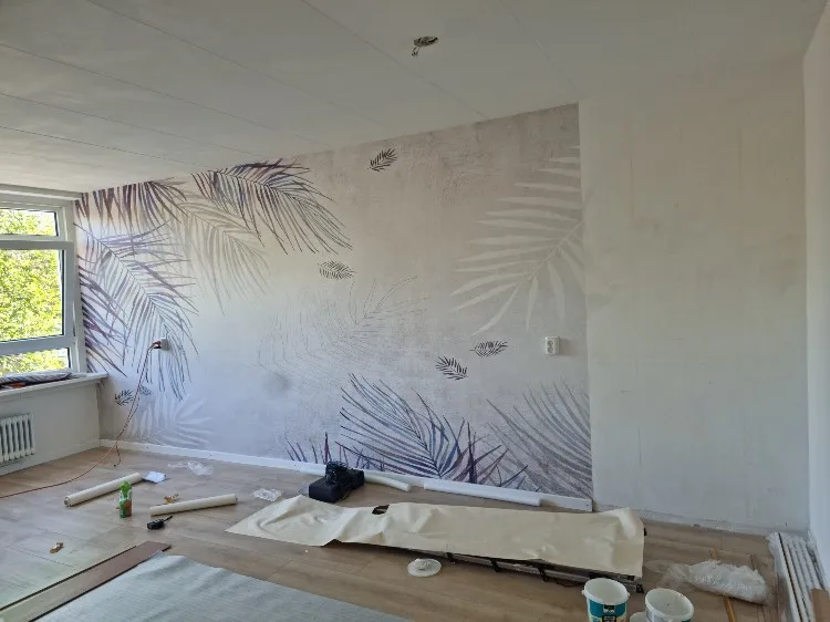 Заказ пришел в течение 14 дней, тщательно упаковано и намотано на пластиковую трубу. Продавец подогнал картину к расмеру нашей стены. Открыли, очень красиво, точно, как в описании. Верхнюю кромку каждой полосы нужно будет срезать. Наклеивть будем встык, это хорошо. Ждем подготовки поверхности стены и увидим, как этот платик будет наклеиваться.