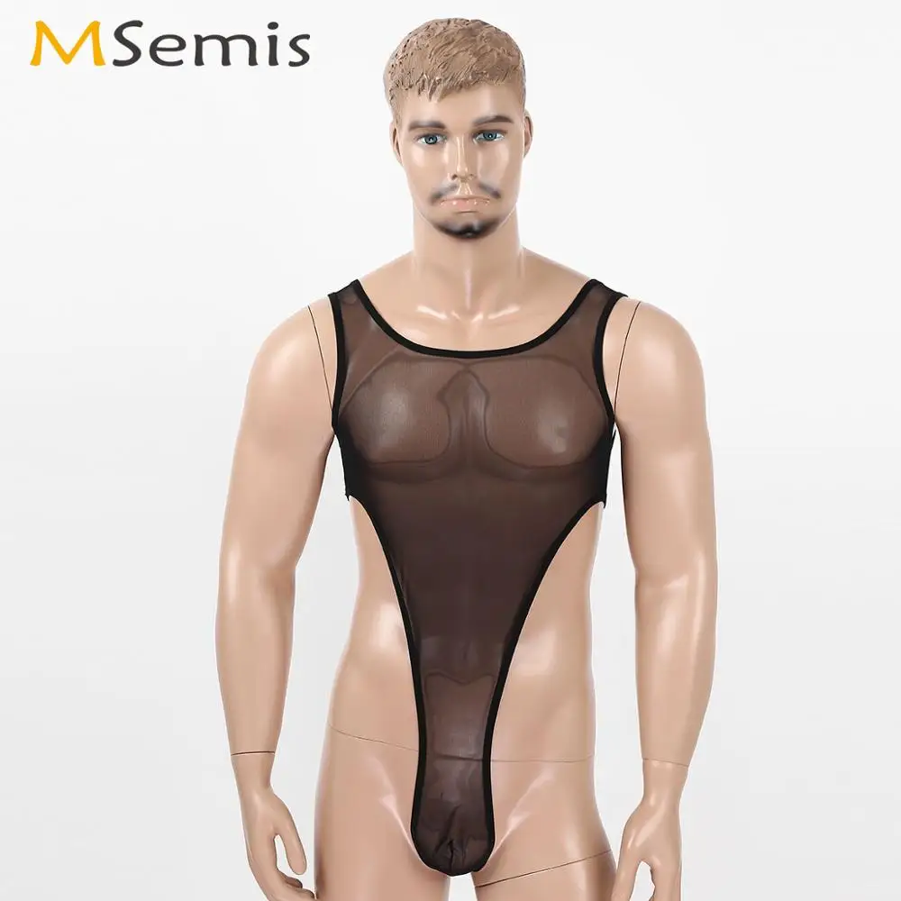 Мужское прозрачное Сетчатое нижнее белье, Неженка, сексуальное нижнее белье без рукавов, стринги с глубоким U-образным вырезом, эротический купальник Ночная одежда для геев, боди-майка