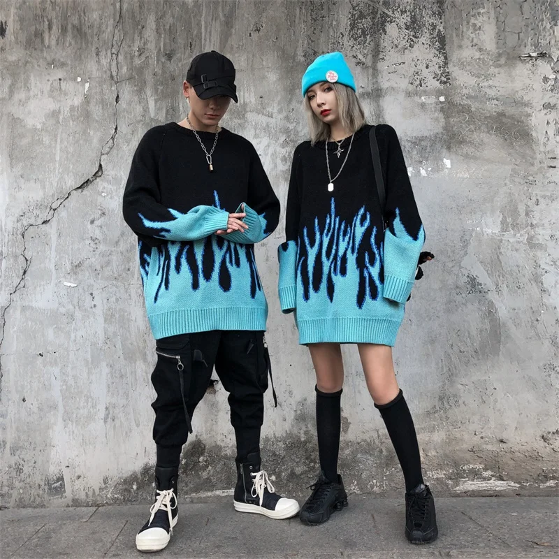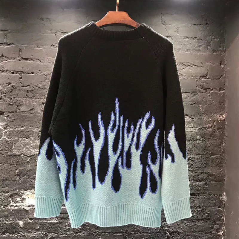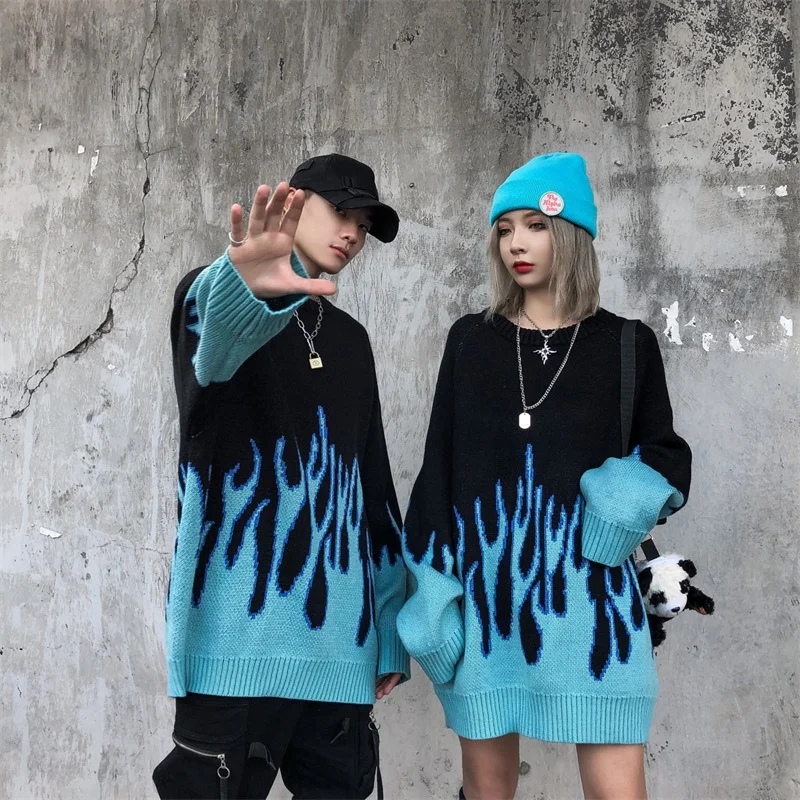 Осень-зима 2020, Вязаный топ с пламенем, жаккардовый модный свитер, свободный, Harajuku, женский, мужской, утолщенный свитер с вышивкой, пуловеры