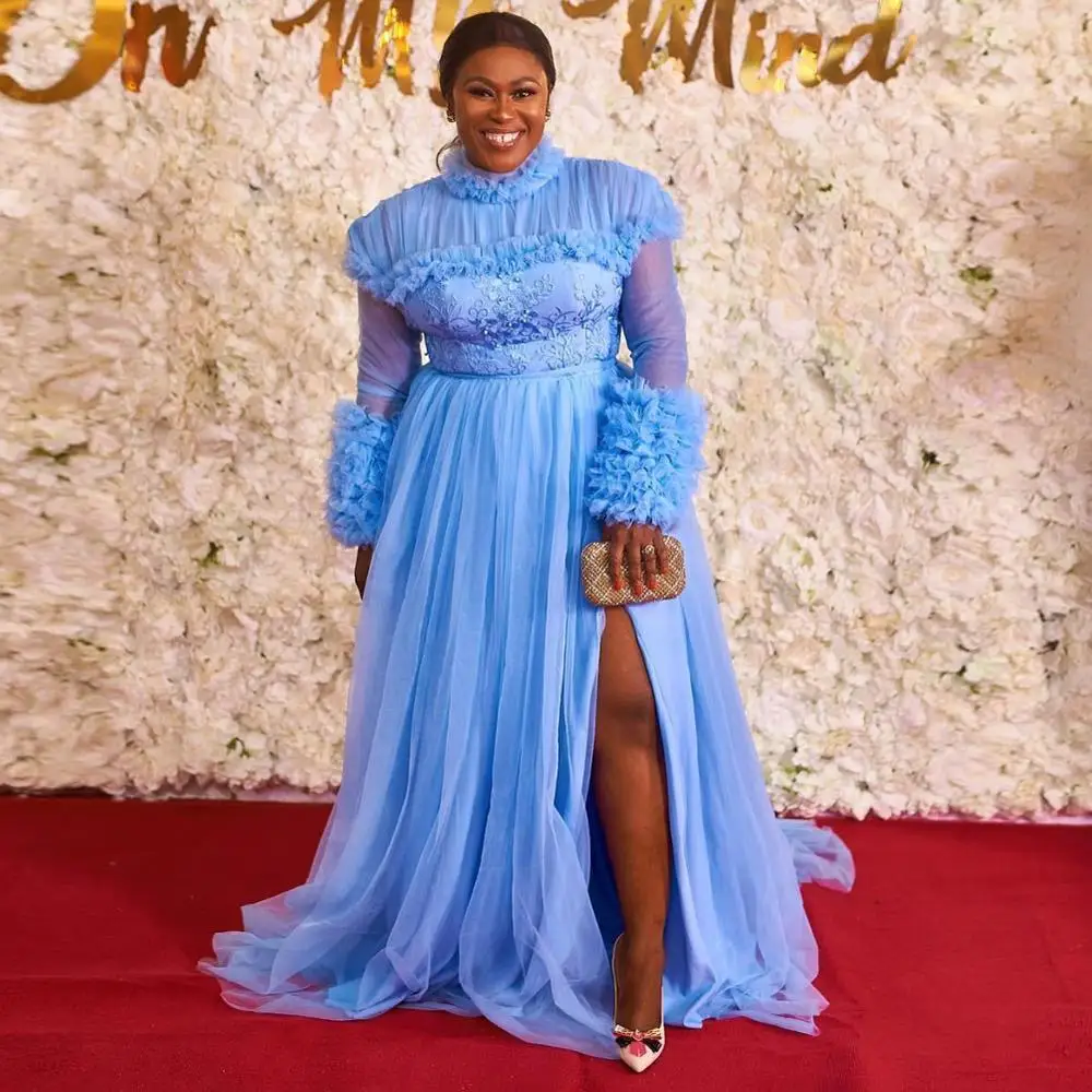 Небесно-голубое Тюлевое платье для выпускного вечера Aso Ebi, вечернее платье с высоким воротником и оборками, сексуальное платье до пола с разрезом и многоярусными формальными нарядами для вечеринки, женское