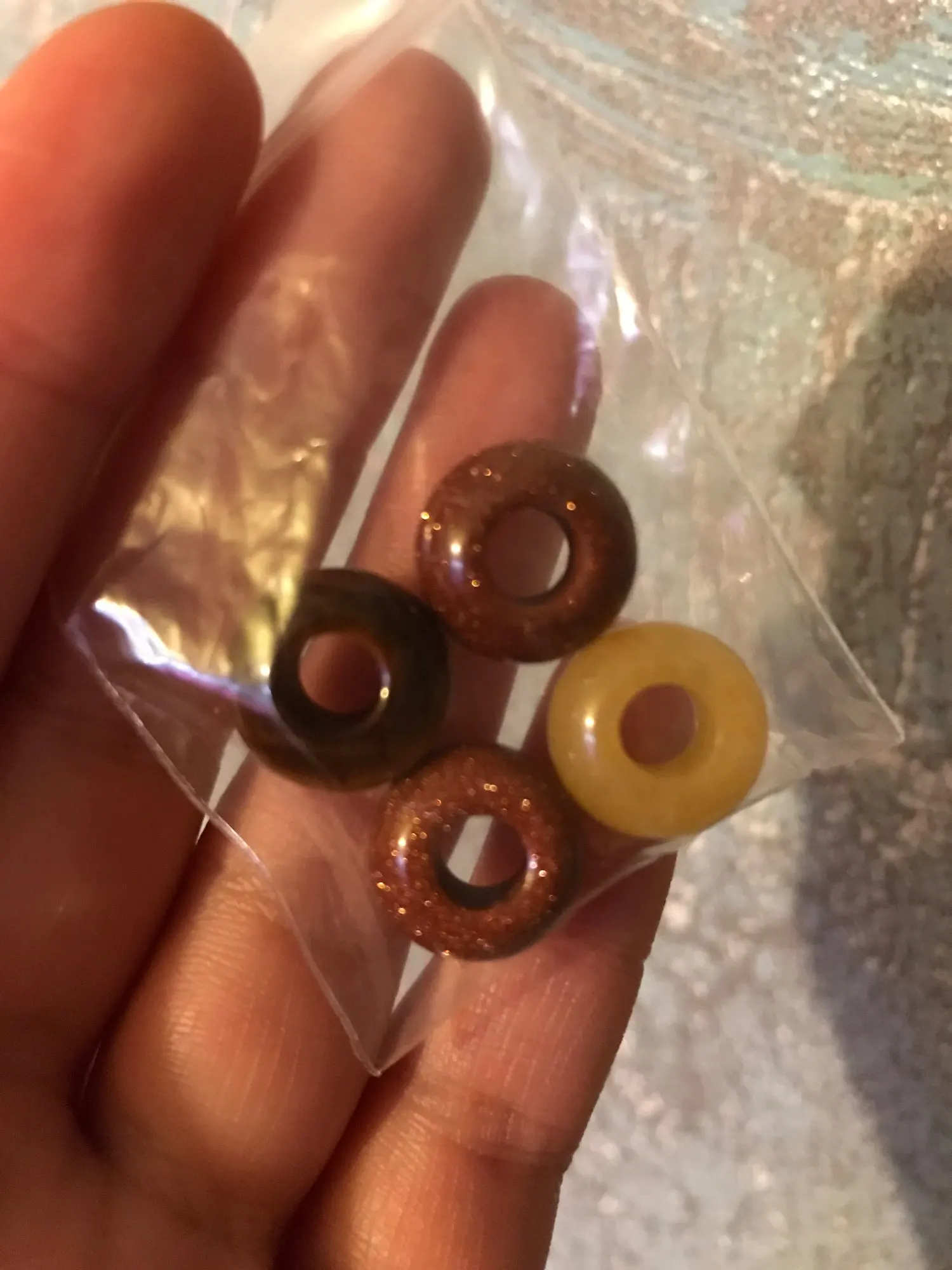 Очень довольна этими каменными бубликами. Они толстенькие, дырки достаточные, чтобы надеть их на серьги. Продавец отправил моментально после оплаты. Посылка дошла быстро. Брала 4 штуки. Продавец подобрал их по цвету для двух серёжек. Спасибо ему )