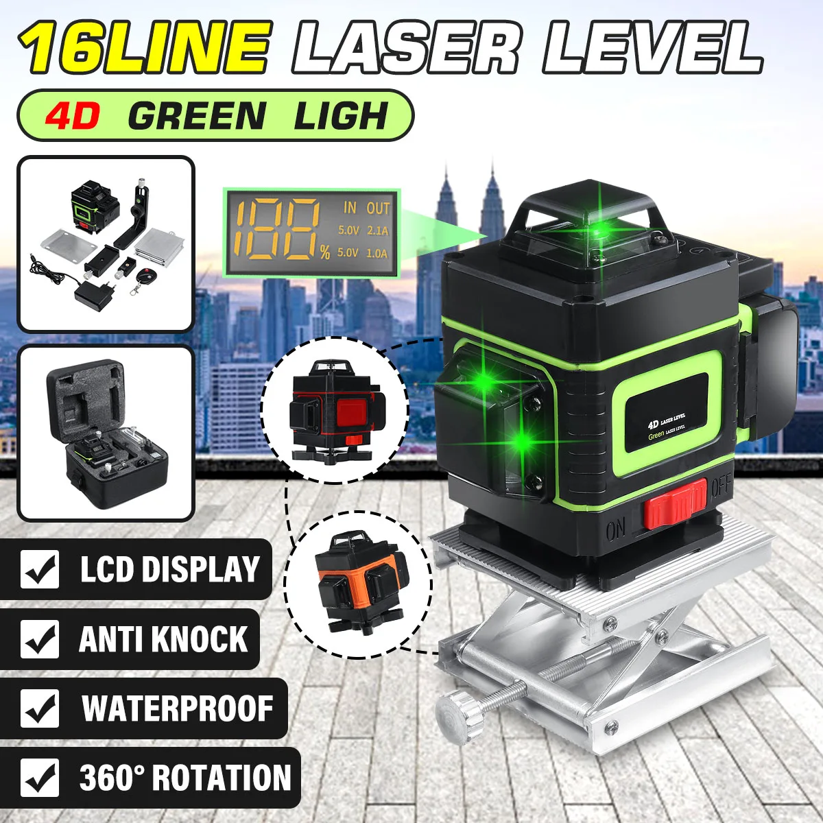 Лазерный уровень, самонивелирующийся 4D 16-линейный зеленый светильник дисплей, поворот на 360 , измерение горизонтали и вертикали, перекрестный пульт дистанционного управления