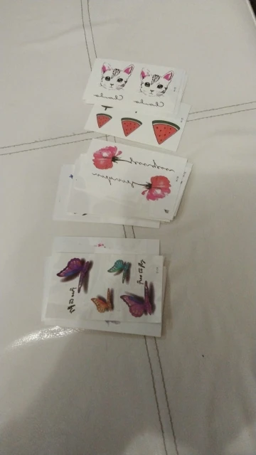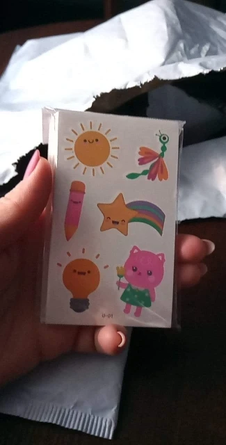 Набор достаточно разнообразен, картинки яркие, сочные, выглядят объемными, перевели девочкам в этот же день. Перевелась довольно легко и просто (если кто помнит, тату из детства), прислонить к коже, намочить губкой, выдержать секунд 10 и вуаля! Носятся примерно дней 5. Продавец ещё подарочек положил! Мелочь, а приятно! Доставка до Хабаровска заняла 16 дней.