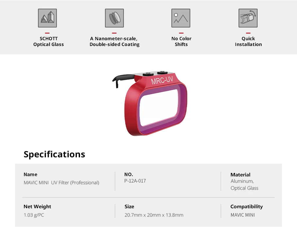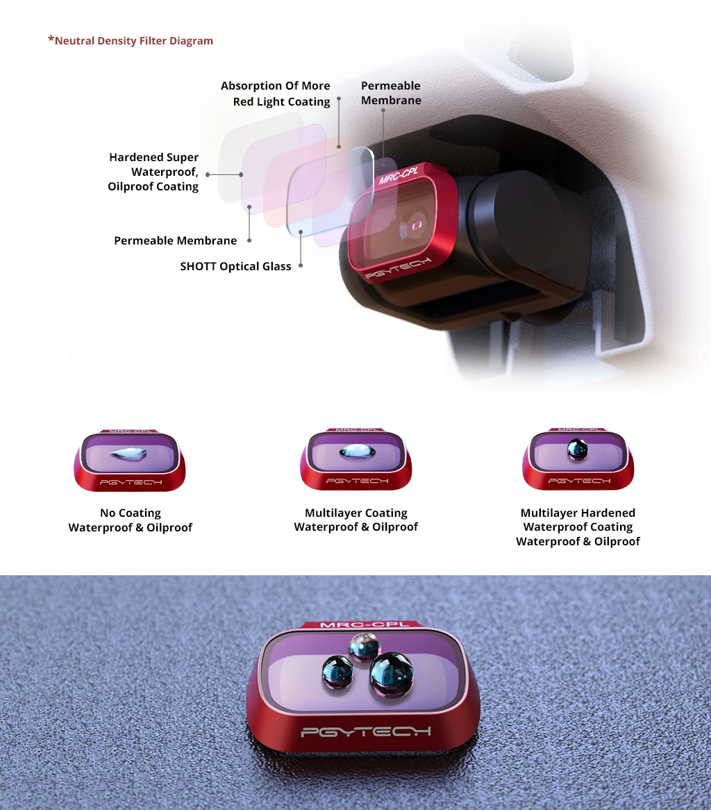 Набор мини-фильтров PGYTECH MAVIC ND (ND 8 16 32 64) уменьшает количество забора светильник, что позволяет камере выбрать правильную экспозицию и предотвратить передержку. В фильтрах используется процесс уменьшения светильник щенности, чтобы избежать проблем с традиционным цветовым отливом ND, почти бесцветным, линзы с использованием немецкого оптического стекла SCHOOT, шлифовальная обработка высокой четкости, использование двухстороннего многослойного нанопокрытия, обеспечивающего высококачественную водонепроницаемость, устойчивость к маслам, обрастанию и царапинам. Фильтр имеет вес всего 1,3 г и быструю упаковку, что не влияет на калибровку головки.