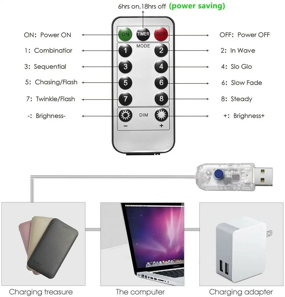 1. Комбинация 2. В волне 3. Последовательный 4. Переменный 5. Чеканка/вспышка 6. Медленное выцветание 7. Мерцание/вспышка 8. Стабильный Таймер: контроль времени, включение 6 часов и выключение 18 часов циркулярно каждый день тусклый-: Темный тусклый +: яркая посылка включает в себя: 5 м или 10 м/20 М медный провод светодиодный светильник с пультом дистанционного управления