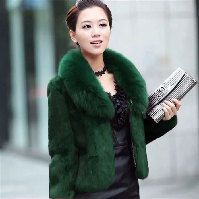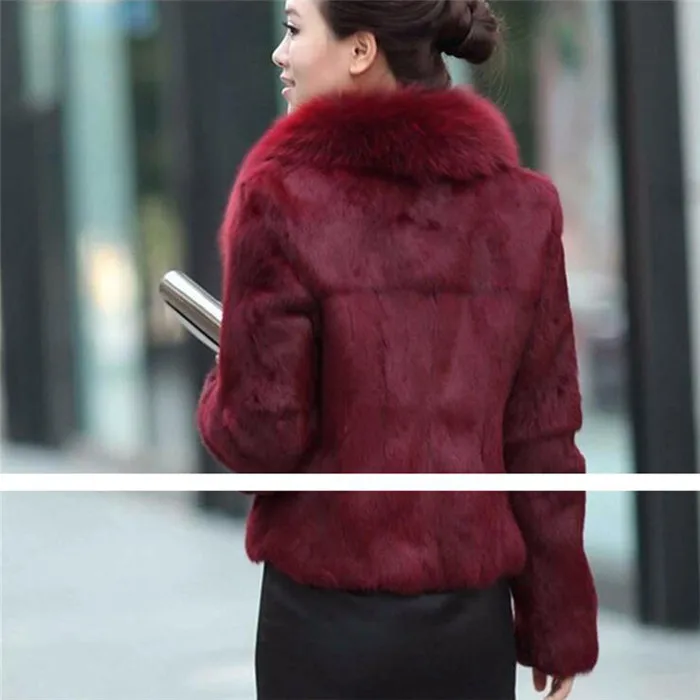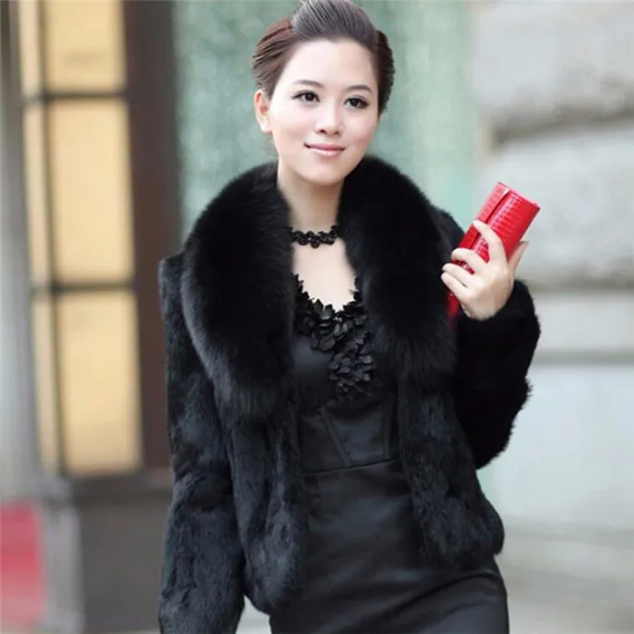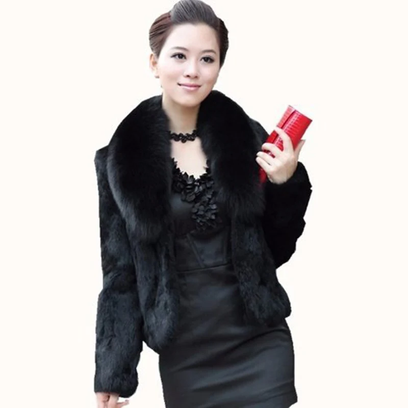 Шуба из искусственного кроличьего меха, женская теплая верхняя одежда, осень-зима, короткая куртка с воротником из черного лисьего меха