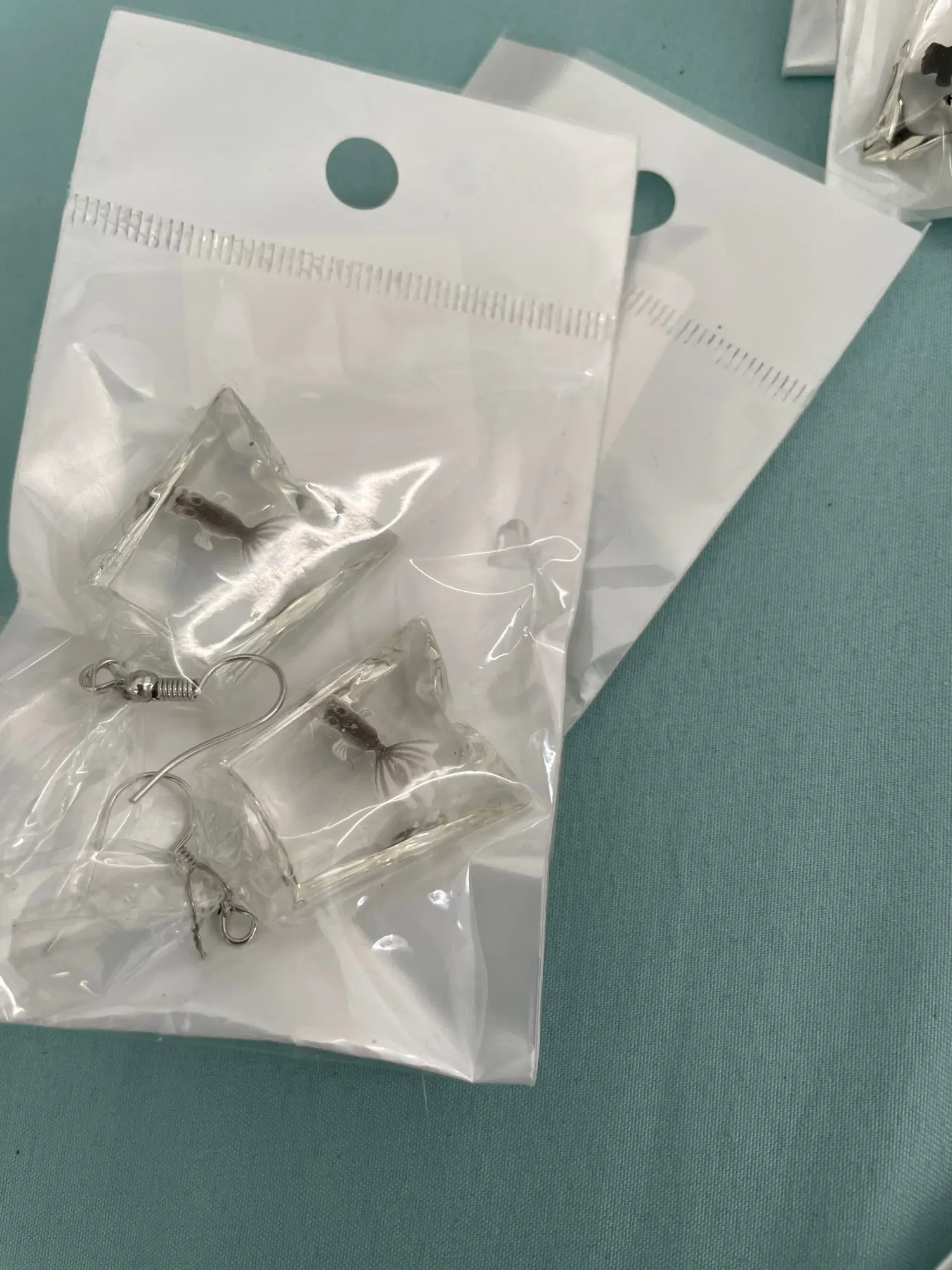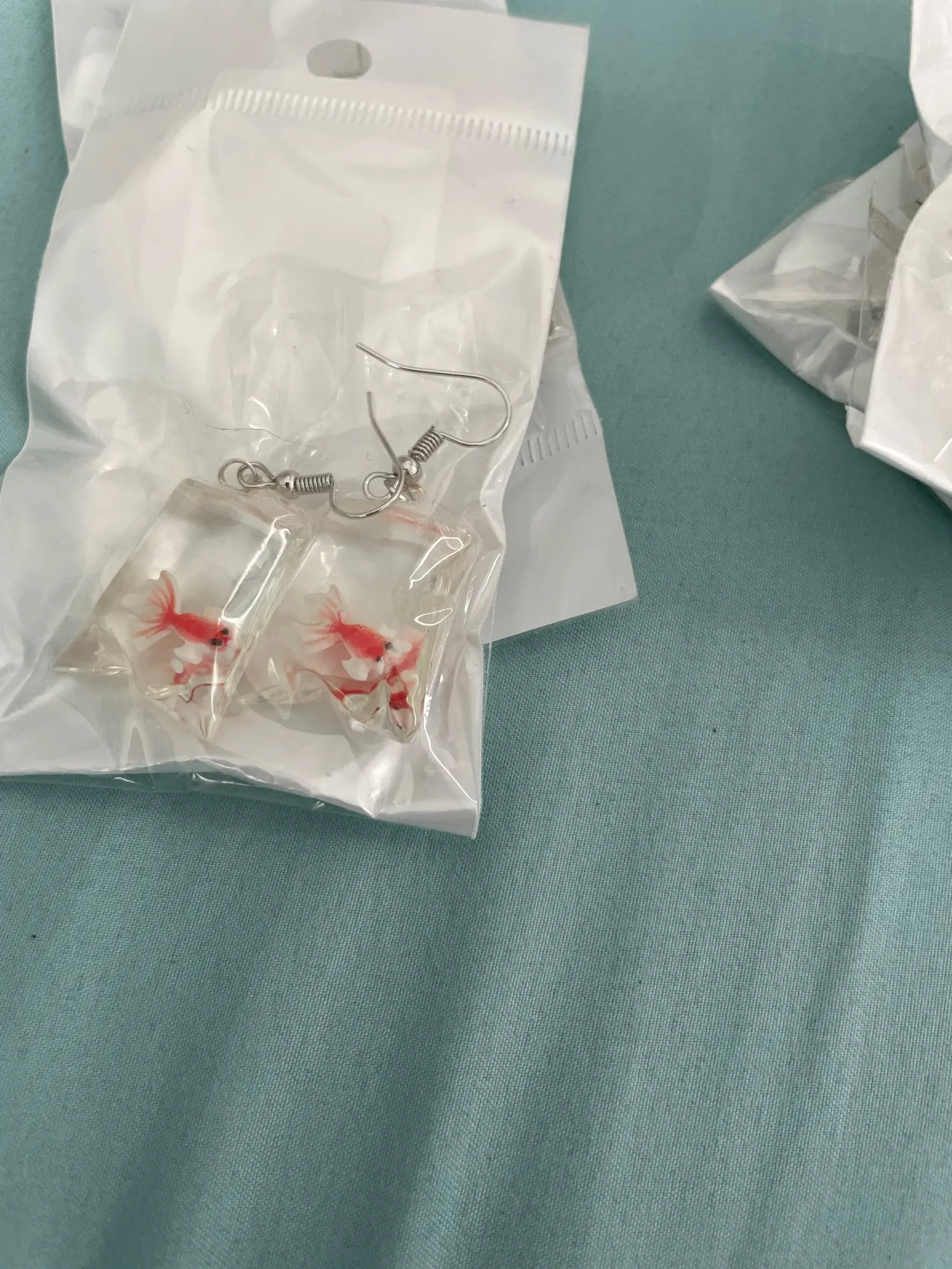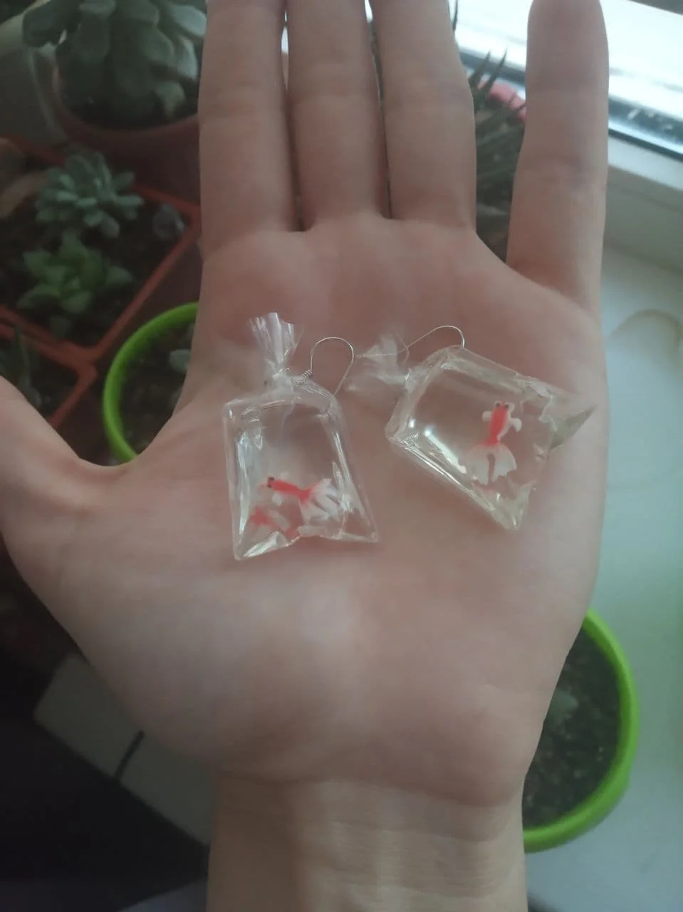 Очень милые рыбки! Внутри мешочков не жидкость, а застывший прозрачный пластик, так что рыбки не "плавают". Немножко подрезала у мешочков хвостики, они на мой вкус были великоваты, но теперь все замечательно! Посылка приехала за 20 дней