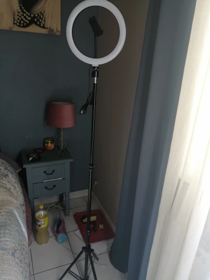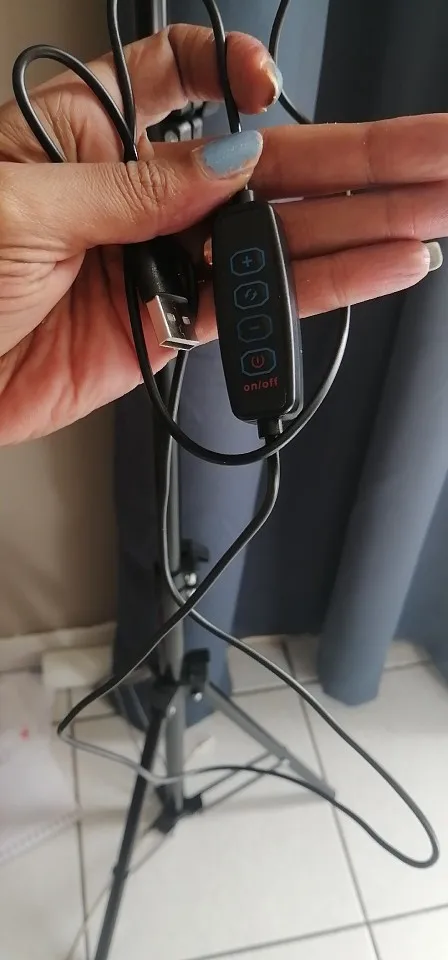 Cette ring light est superbe ! On peut changer la lumière sur 3 tons : froid (blanc), tiède (jaune), et chaud (Orange). J’ai pris celle de 160cm puisque je mesure 173cm. On peut ajuster la taille facilement. Et elle est simple à monter. Un petit interrupteur Bluetooth est fourni avec. Par contre, au niveau de la prise c’est uniquement USB, il n’y a pas de chargeur de secteur.