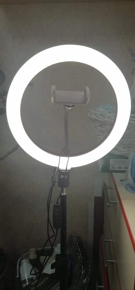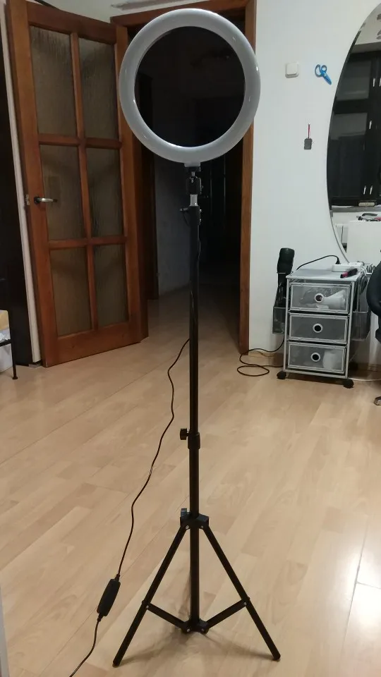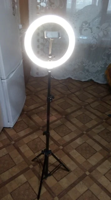 заказывал к НГ как подарок. Посылка опоздала на 5 дней, чем был очень опечален. Шла 24 дня до Омска. долго почему то лежала на складах Китая. сам товар хороший, штатив надёжно удерживает телефон и кольцо. поднимается на высоту около 180 см. есть три режима освещения теплый, холодный свет и что то среднее, и регулировка интенсивности. питание usb.