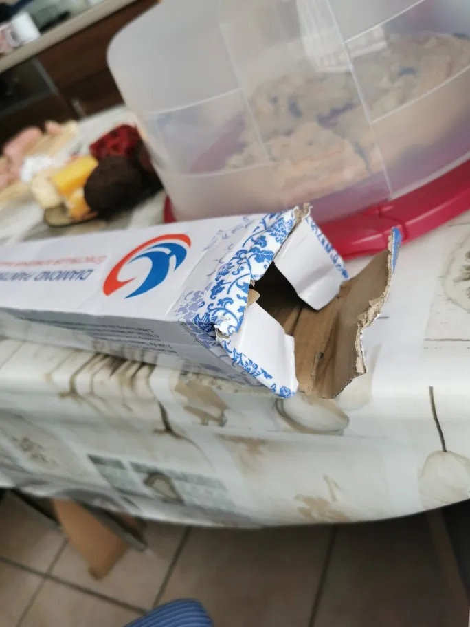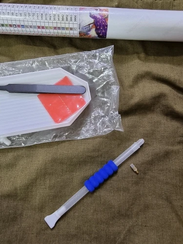 Коробка пришла согнутая пополам, основа картины помятая, не знаю, отразится ли это на готовой работе, пока положил под пресс.
