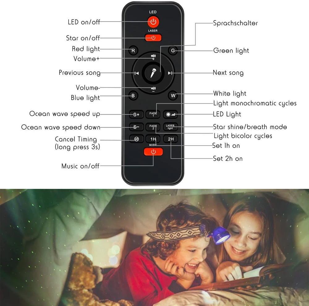 1X Светодиодный проекционный светильник 1 пульт дистанционного управления (батарея в комплект не входит) 1X USB кабель 1X Руководство пользователя