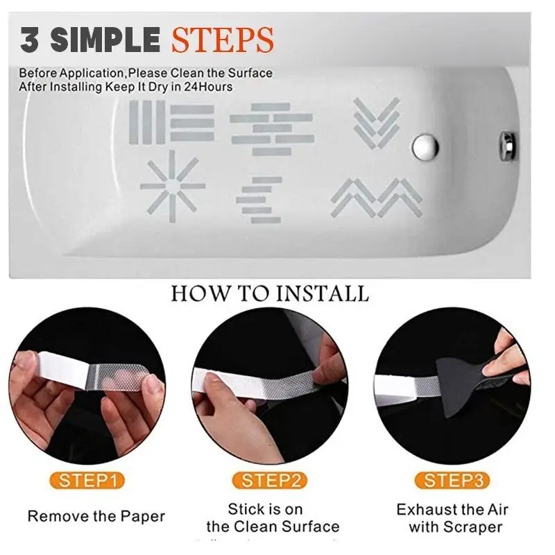 Широкое применениеНескользящие наклейки для ванной подходят для любой скользкой поверхности,Такие как ванны, душевые кабины, Полы Ванной комнаты, бассейны, лестницы, дверной проем и т. д., предотвращая скольжение и обеспечивая безопасность во время принятия душа.