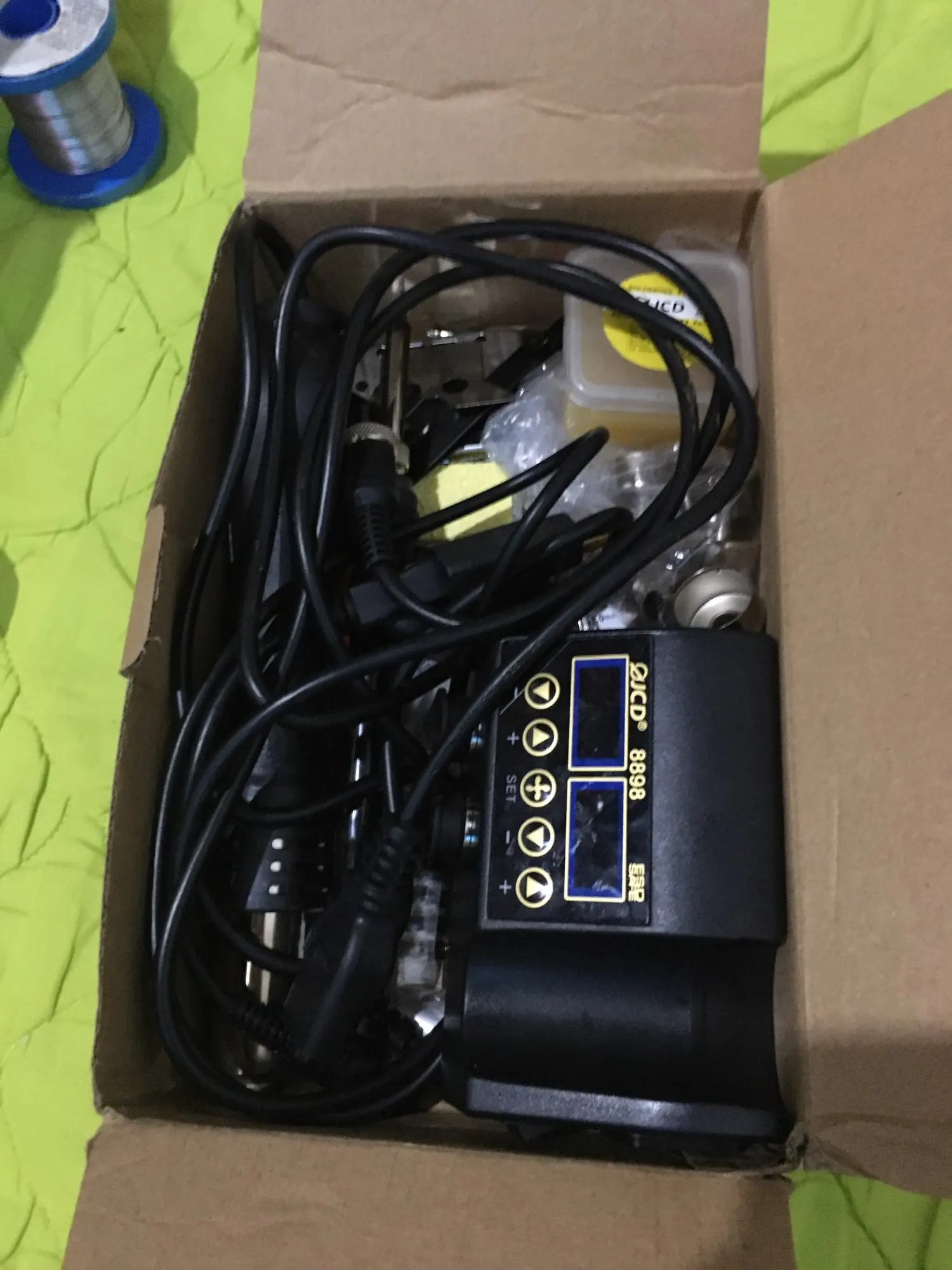 11 листопада день зробив з десяток замовлень, це отримав 30-го, тобто першим. Комплект у повній відповідності. Картонну коробку запаковано у кульок з пупирцями. Коробка на куточках прим'ята, але все ціле. Фото не бачу сенсу робити, бо все як і на інших. Увімкнув фен - все працює, регулятор температури до 310 град. С, перевірив на материнській платі, деталі випаює, паяльник - гріє, ще не паяв, але вже видно що все добре. Крім станції у коробці лежали коротенька брошурка англійською і картка гарантії. Думаю, що не знадобиться. Продавцем і товаром - задоволений. Рекомендую!
