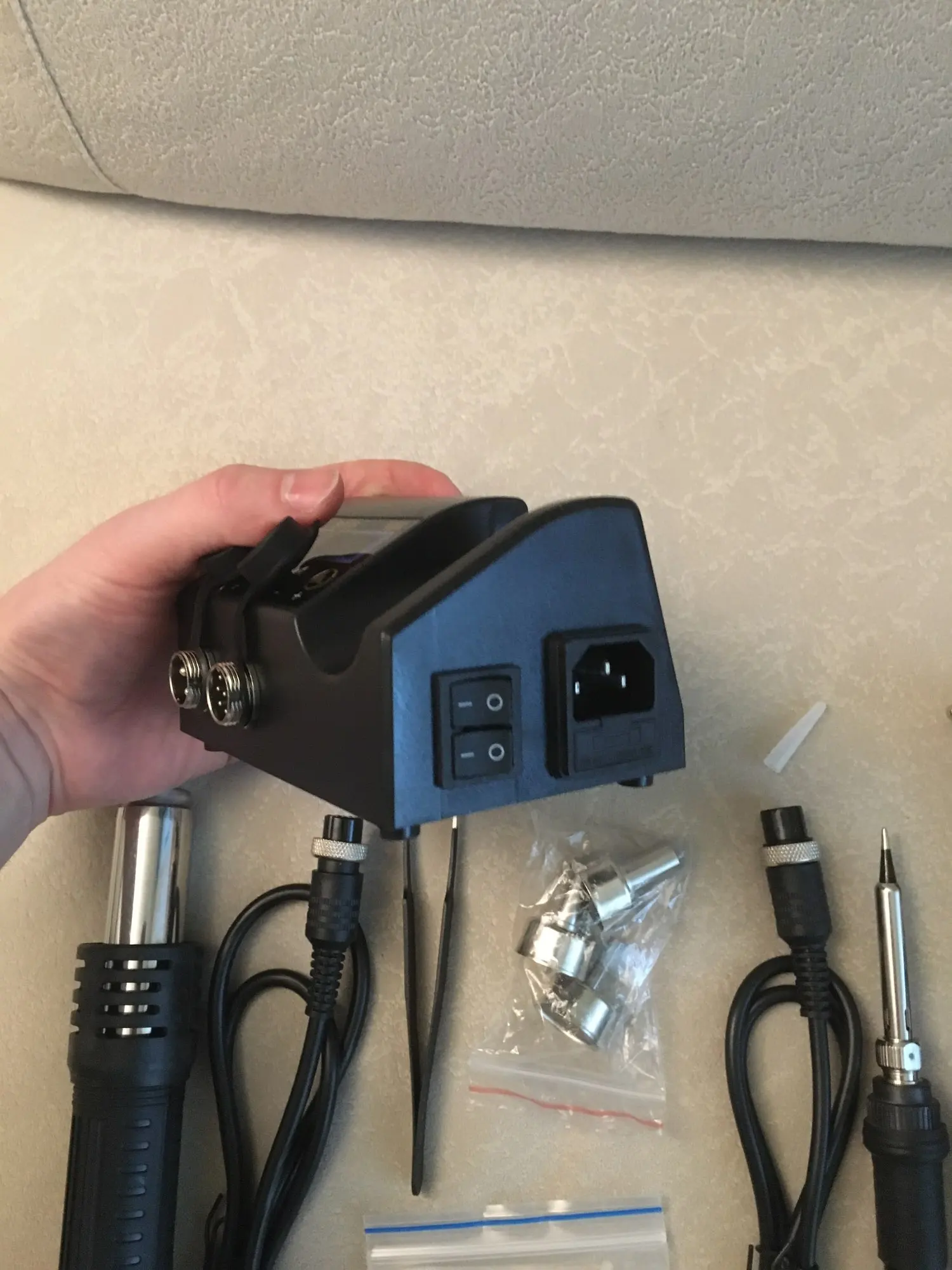 Пришло все в полном комплекте. Подставка для паяльника - хлипенькая и легкая, при работе ездит по столу. Феном доволен. для тех, кто бережно относится к своим персональным данным есть надёжный способ стереть их с пакетов от посылок перед отправкой в мусор - путем прогревания наклеек феном. паяльник и фен включаются отдельными кнопками. если работающий фен положить в паяльную станцию - он постепенно перестает работать и выкдючается, если его снять быстро прогревается до выставленной температуры - очень удобно!