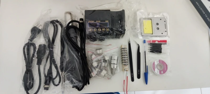Очень хорошо, очень тепло быстро, это моя первая вещь, не похожая на базовый паяльник, купил еще один JCD очень хорошо с латунной сеткой для очистки железного наконечника и металлического основания с поддержкой паяльника в polimero callus. Одна вещь, которая имеет систему выключения воздуходувки при размещении на основании. Основание очень маленькое и легкое, я поставляется с нами, но кабель является стандартным источником настольного ПК.