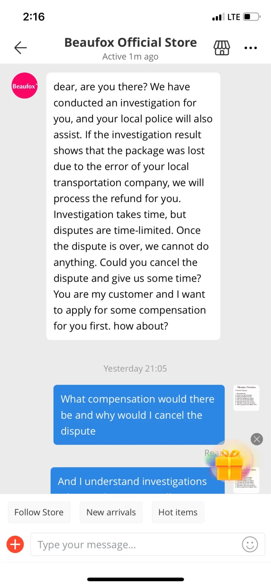 Свяжитесь с продавцом и дайте им знать, что я не получил свою посылку. Я возвращался к этому продавцу уже около пяти дней, и я все еще не получил возврат денег или предложение возврата денег или чего-то еще. Я отложил спор, и позже они сказали мне отменить спор, что они компенсируют мне 8 долларов, это не компенсация за восемь $87, которые я никогда не получил, я не рекомендую покупать у это компания. И удачи, если у вас есть проблема, потому что они сделают все возможное, чтобы не исправить это. Я бы не дал одну звезду, но вы должны были что-то поставить, чтобы поставить отзыв