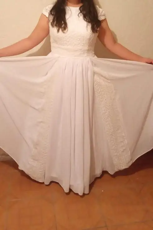 Прежде всего, я хотел бы получить сообщение с продавцом, дизайн платья и желание починить платье в соответствии с моим ожиданием и моим размером, это хорошо мне подходит... Я заказал 2 типа платья: цвет слоновой кости и белый. Должен сказать о белом платье, который мне не понравился, потому что оттенок юбки отличается от топа, поэтому я бы порекомендовал цвет слоновой кости (но это может быть только вопрос вкуса), но цвет слоновой кости не был так хорошо сшит (Я означает, что кружево на юбке не сшито прямо), поэтому я надеюсь, что оно будет восстановлено местным производителем платьев. Но, возможно, вам будет больше удачи. Предложение: за эту цену это очень красивое платье!