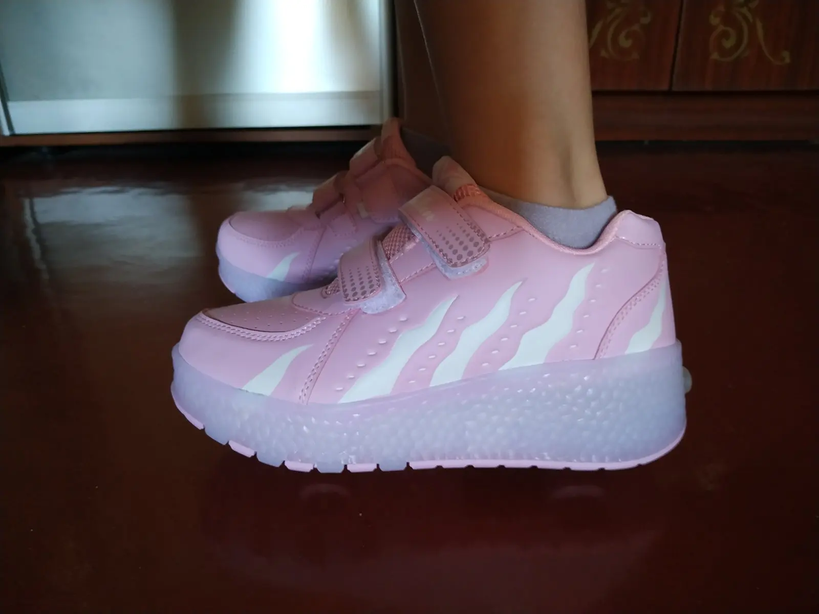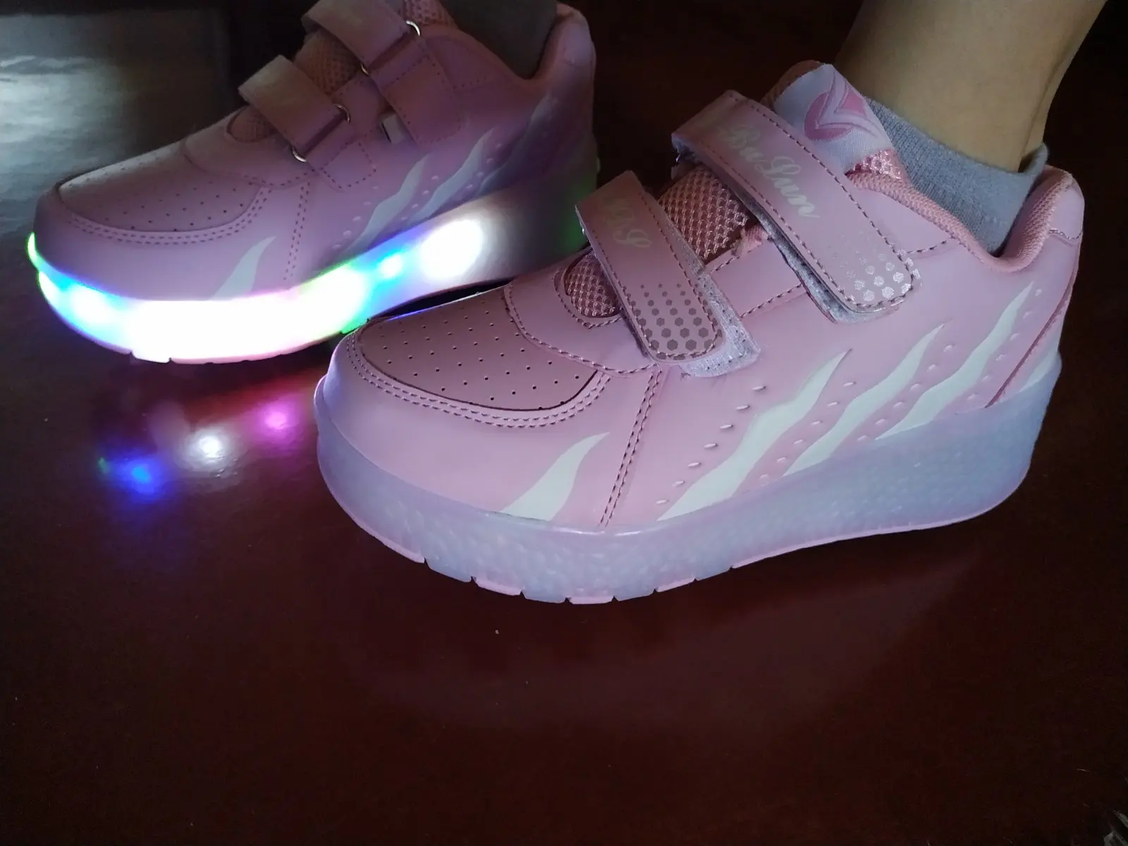 Хорошие, но достаточно тяжелые кроссовки. Размер соответствует указанному. Ребенок доволен, хотя катание на роликах не слишком удобное, может, из-за отсутствия тренировки. Один кроссовок пришел менее заряженным, чем второй. На зарядку можно поставить сразу оба кроссовка. У нас они синхронно мигают, когда заряжаются. Продавец выслал очень быстро. Из Китая на Украину доставка заняла 17 дней. Получали на Новой почте.