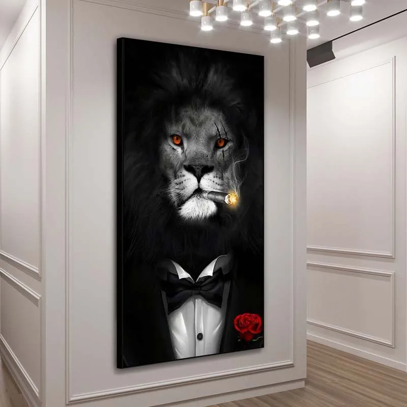 Абстрактное искусство, холст с изображением Льва, курение, настенные картины, картины, черный дикий лев в костюме, животные, холст, картина для дома