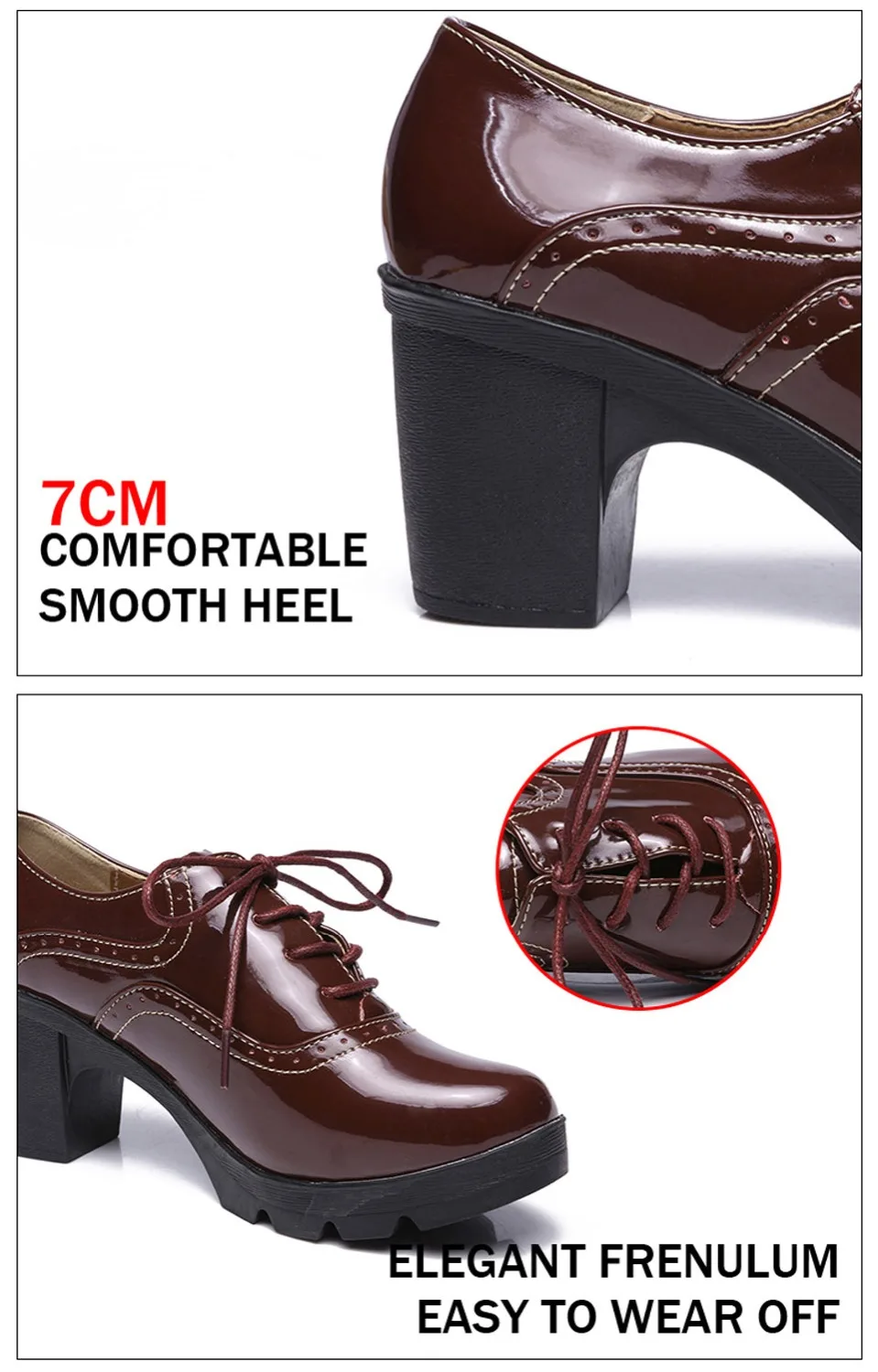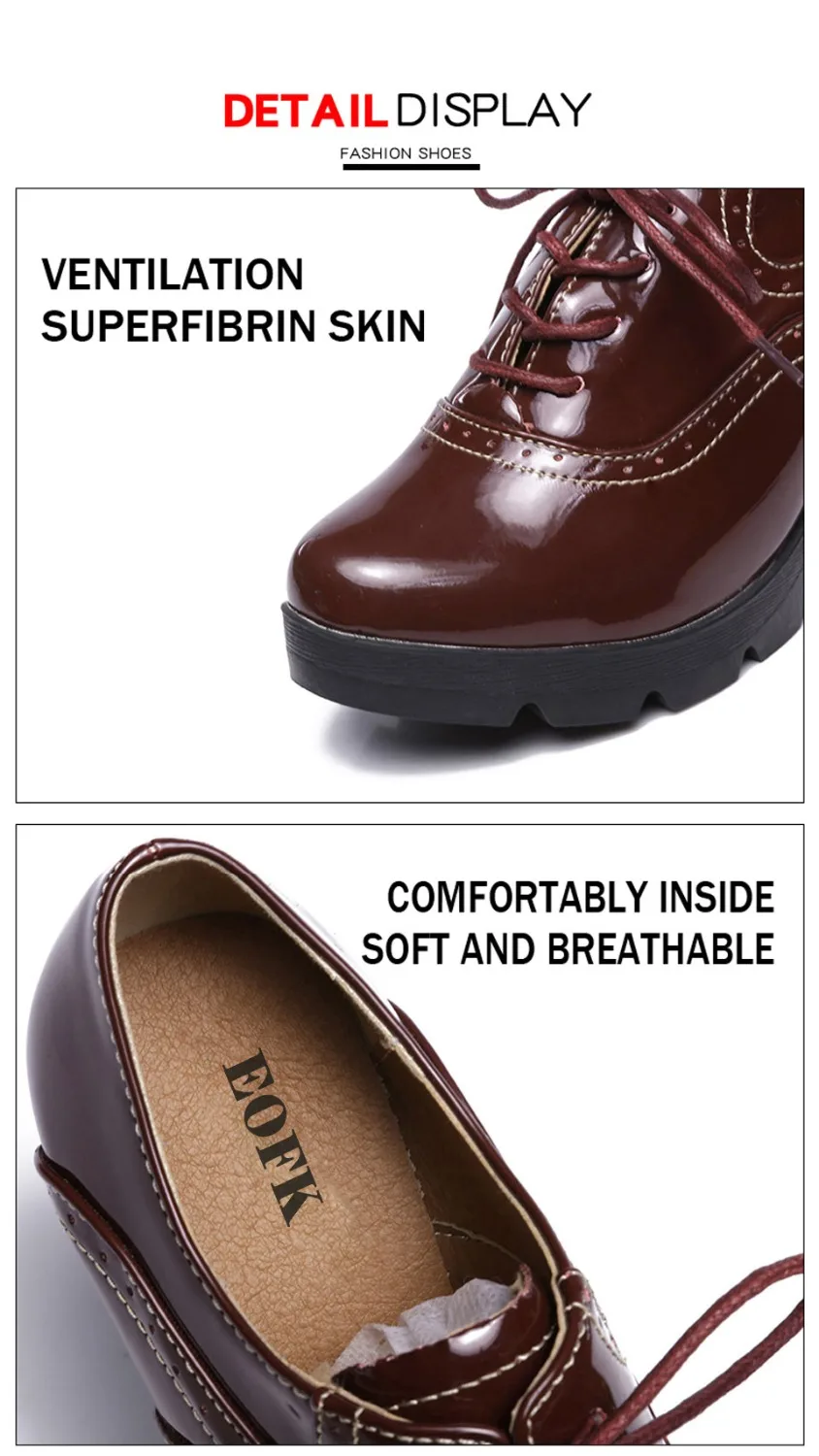 EOFKсезон весна-осень; Женская обувь с перфорацией типа броги Лакированная кожа высоком квадратном каблуке классические туфли на каблуке, на шнуровке, черного цвета Женские Дерби туфли "Оксфорд", женская повседневная обувь