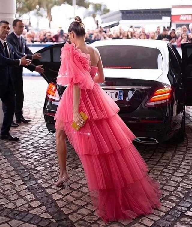 Женское платье на одно плечо, длинное вечернее платье из тюля персикового красного цвета с молнией сзади и многоярусной застежкой-молнией сзади, 2020