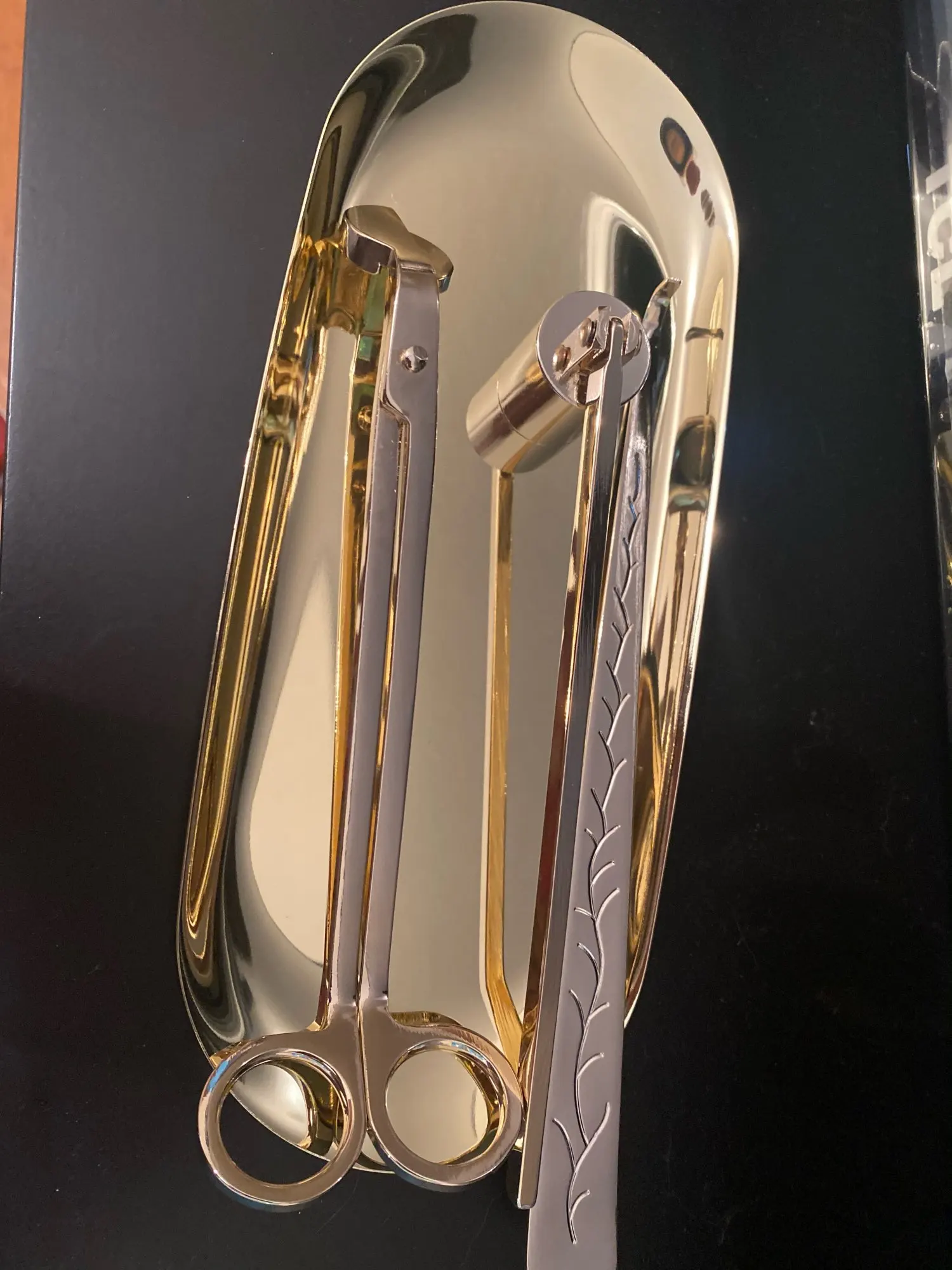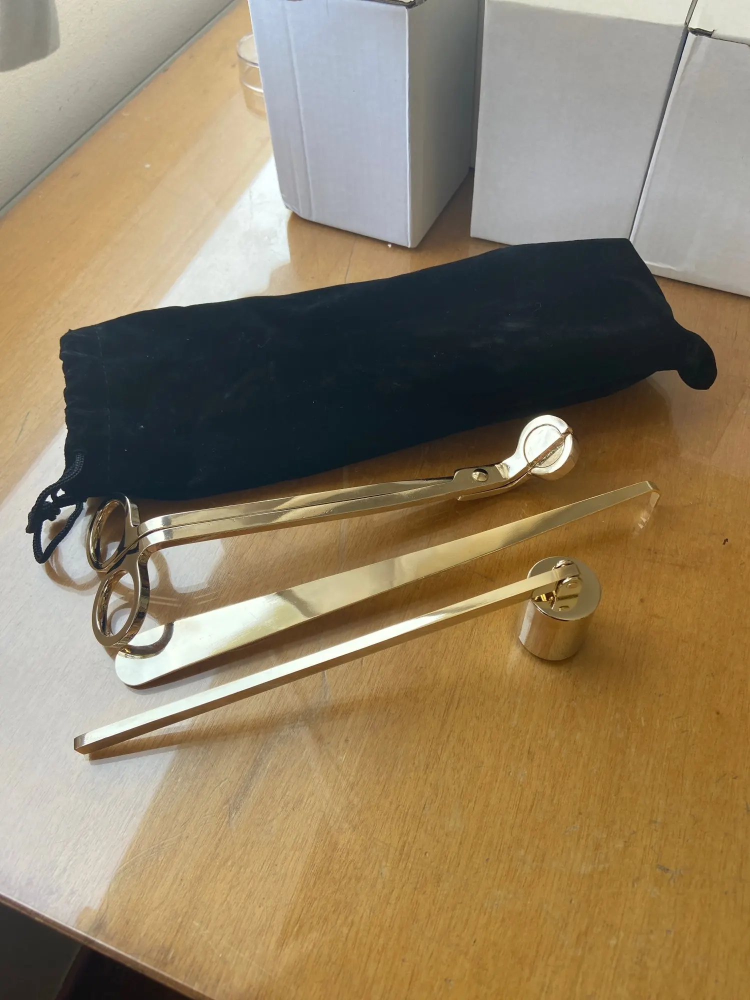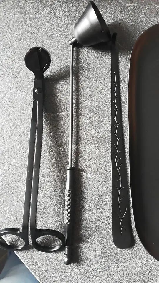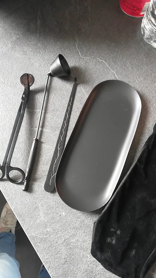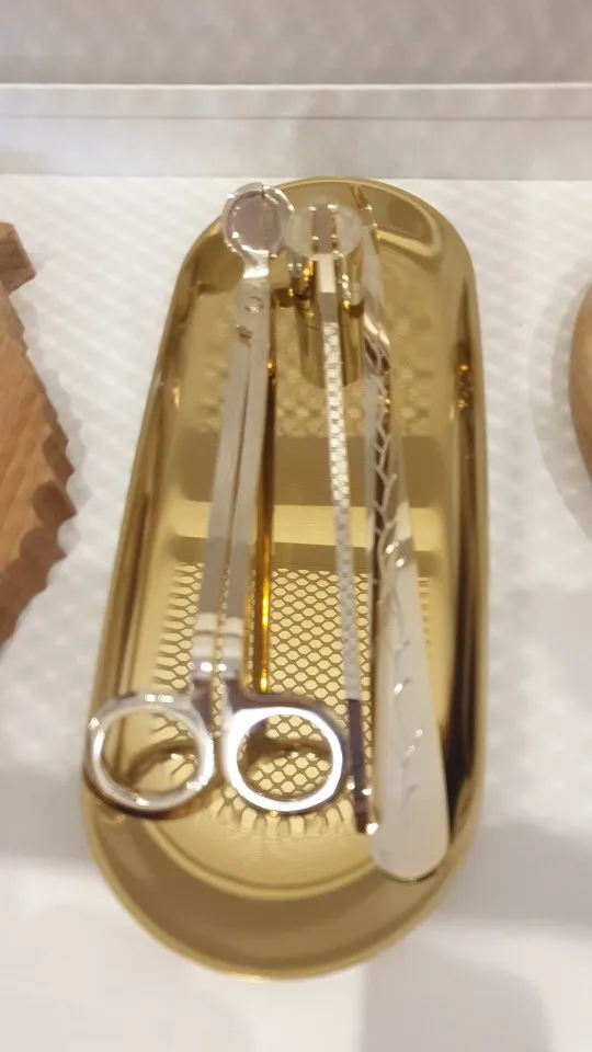 Очень красивый набор, я очень довольна покупкой. Удобные ножницы, отрезает и деревянный фитиль, колпачком удобно гасить. Доставка в Киев 3 недели meest-express. Упаковано на совесть, во много слоев пупырчатой пленки, набор в бархатном мешочке.