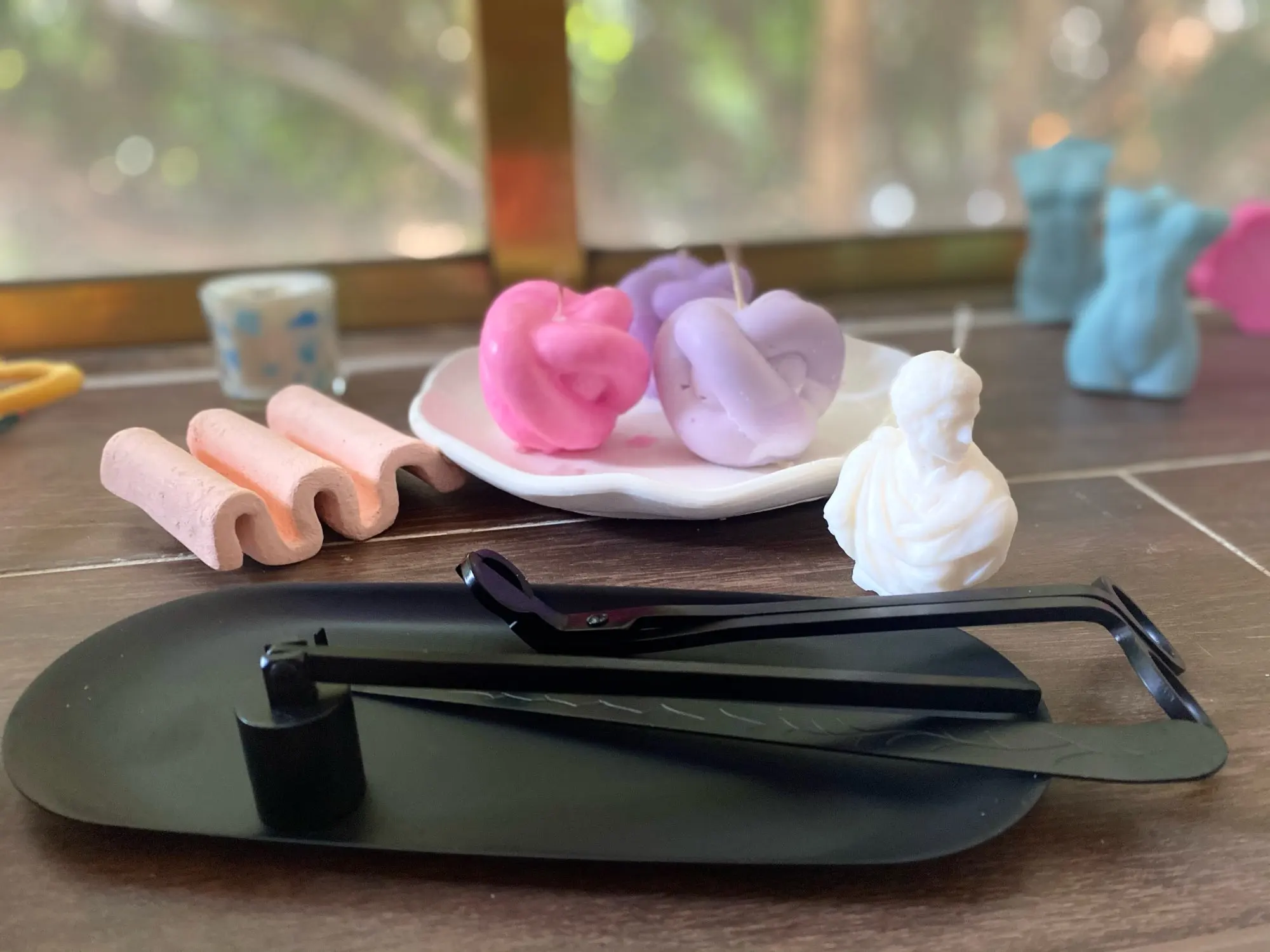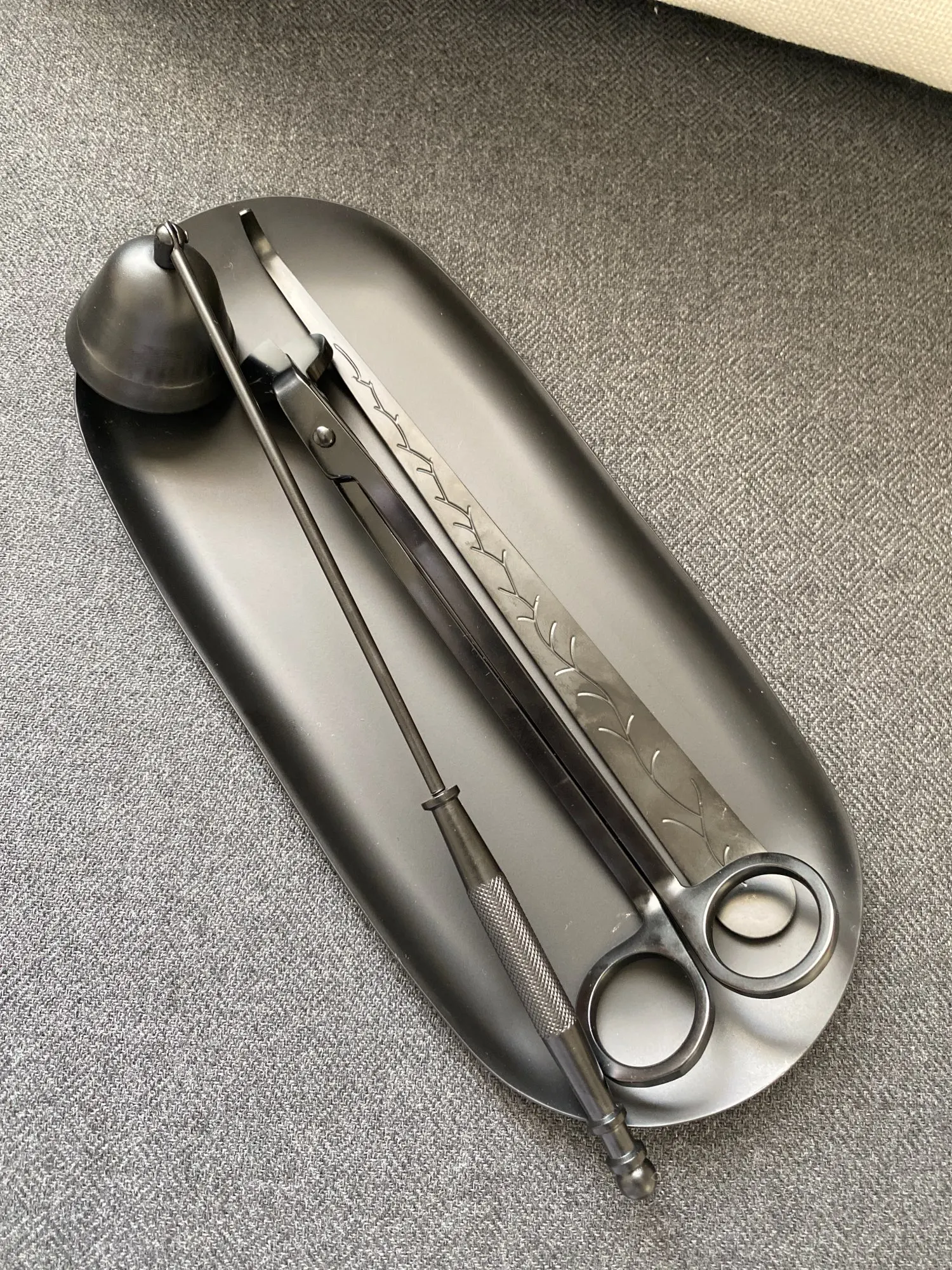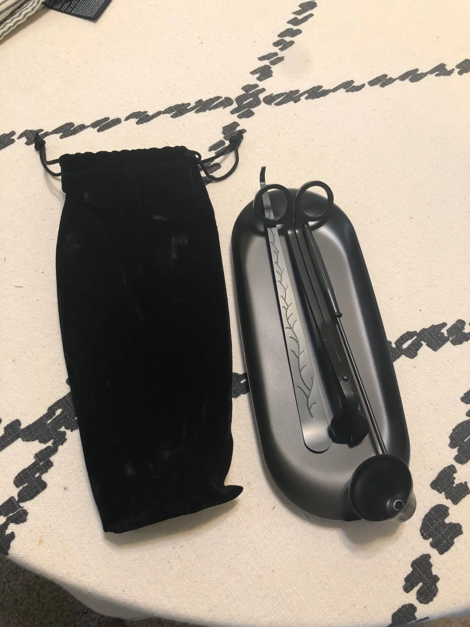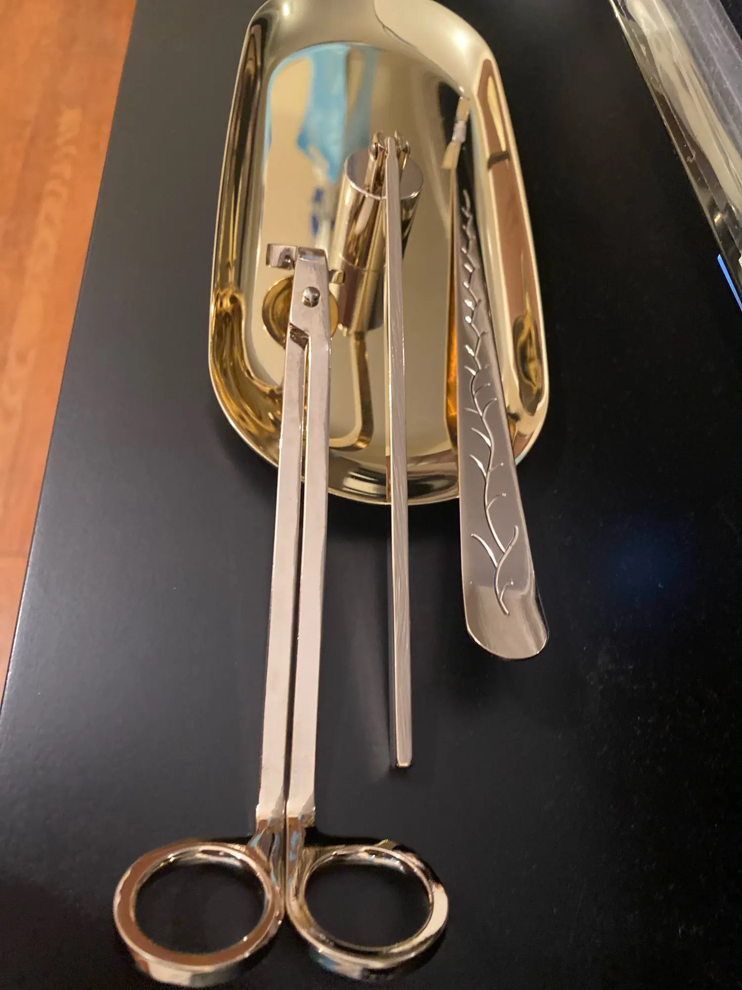 Очень красивый набор, я очень довольна покупкой. Удобные ножницы, отрезает и деревянный фитиль, колпачком удобно гасить. Доставка в Киев 3 недели meest-express. Упаковано на совесть, во много слоев пупырчатой пленки, набор в бархатном мешочке.