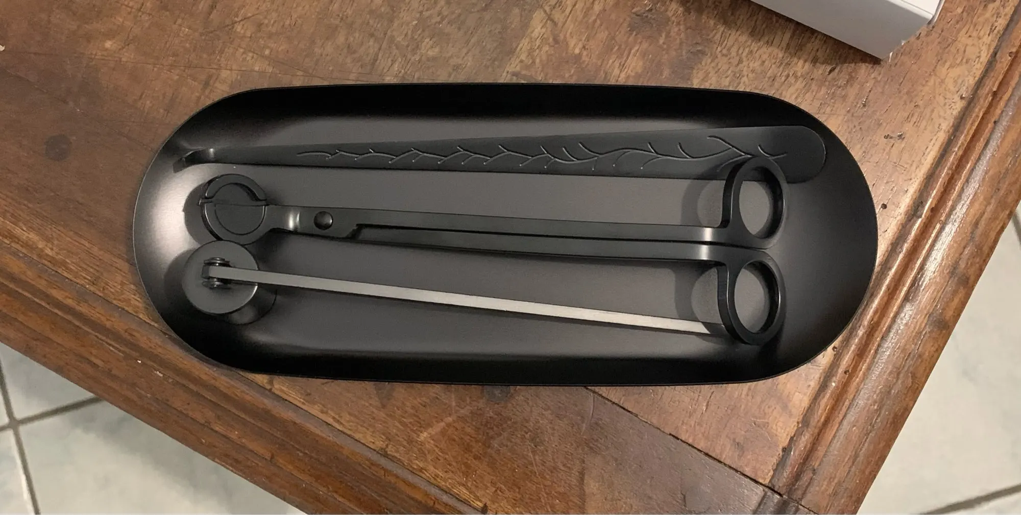 Поднос пришел одного оттенка, а инструменты другого... это вообще не круто. Настолько резало глаз, что пришлось поднос убрать под кисти, а родные инструменты просто сложить в ящике. За такую стоимость терплю такие приколы(((