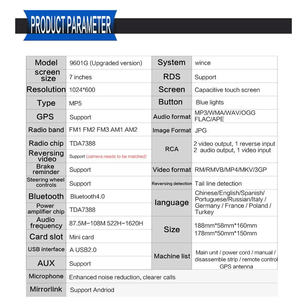 Модель: 9601 модернизированнаяТип: MP5 плеерСистема: winceЧип декодера: C200Размер экрана: 7 дюймов резистивный сенсорный экранРазрешение экрана: 1024*600Светильник ка кнопок: 7-цветный светСистема времени: регулируемая система 12 часов/24 часаВремя работы в режиме ожидания: не поддерживаетсяПодключение мобильный телефон: Поддержка AndroidМобильный телефон зарядки: поддержка зарядки Android мобильный телефонРадиодиапазон: FM1/FM2/FM3/AM1/AM2Радиомикросхема: QN8035RDS: ПоддержкаOBD: не поддерживаетсяМногоязычный: китайский/английский/испанский/португальский/русский/итальянский/немецкий/французский/Польский/ТурецкийВидеовыход: 2 канала видеовыхода (не поддерживает двойной экран)Реверсивный Видеовход: ПоддержкаМетод обнаружения задним ходом: линия обнаружения задним ходом, подключенная к источнику света заднего ходаТелевизор: не поддерживаетсяПароль подключения Bluetooth: для нескольких мобильных телефонов может потребоваться пароль, пароль: 0000Настройка логотипа: не поддерживаетсяФункция напоминания о торможении: ПоддержкаФункция управления рулевым колесом: ПоддержкаBluetooth: версия Bluetooth 4,0Чип усилителя: TDA7388Радиочастота: 87,5 ~ 108,0 МГц, 522 ~ 1620 ГцСлот для карт памяти: для карты памяти TF (не входит в комплект)USB-порт: 1 x USB2.0Кнопка сброса: не поддерживаетсяОригинальное управление на руль автомобиля: ПоддержкаПредставление RCA-терминала: 2-канальный видеовыход, 1-канальный Реверсивный вход, 2-канальный аудиовыход, 1-канальный видеовходФронтальный аудиовход aux: поддержкаРегулятор громкости: ПоддержкаПоддерживаемые Аудио форматы: MP3/WMA/WAV/APE/FLACПоддерживаемые форматы видео: RM/RMVB/AVI/MP4/MKV/3GPПоддерживаемые форматы изображений: JPGВес: 1700 гРазмер: 184*158*50 мм