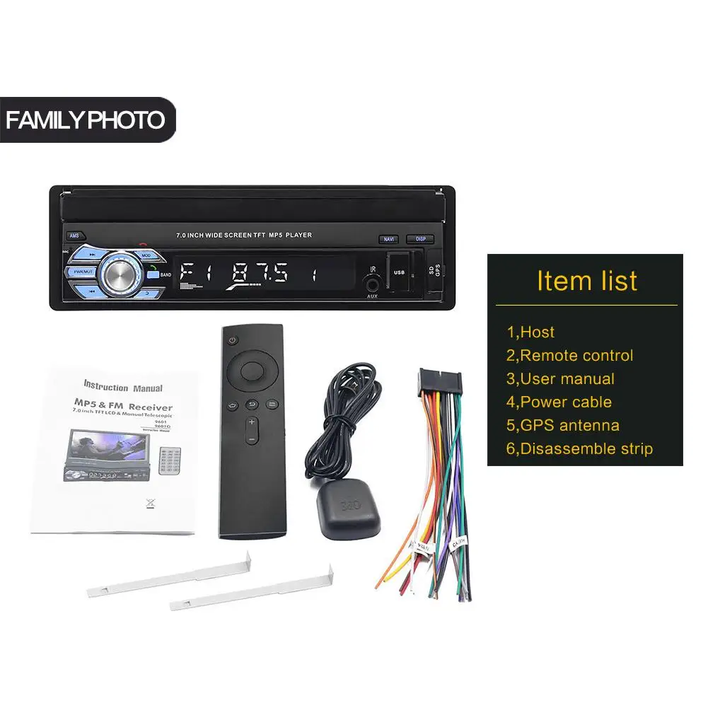 Список:1 Автомобильный MP5-плеер1 пульт дистанционного управления1 x Кабель Питания1 x Руководство пользователя1 x GPS-модуль (опционально)