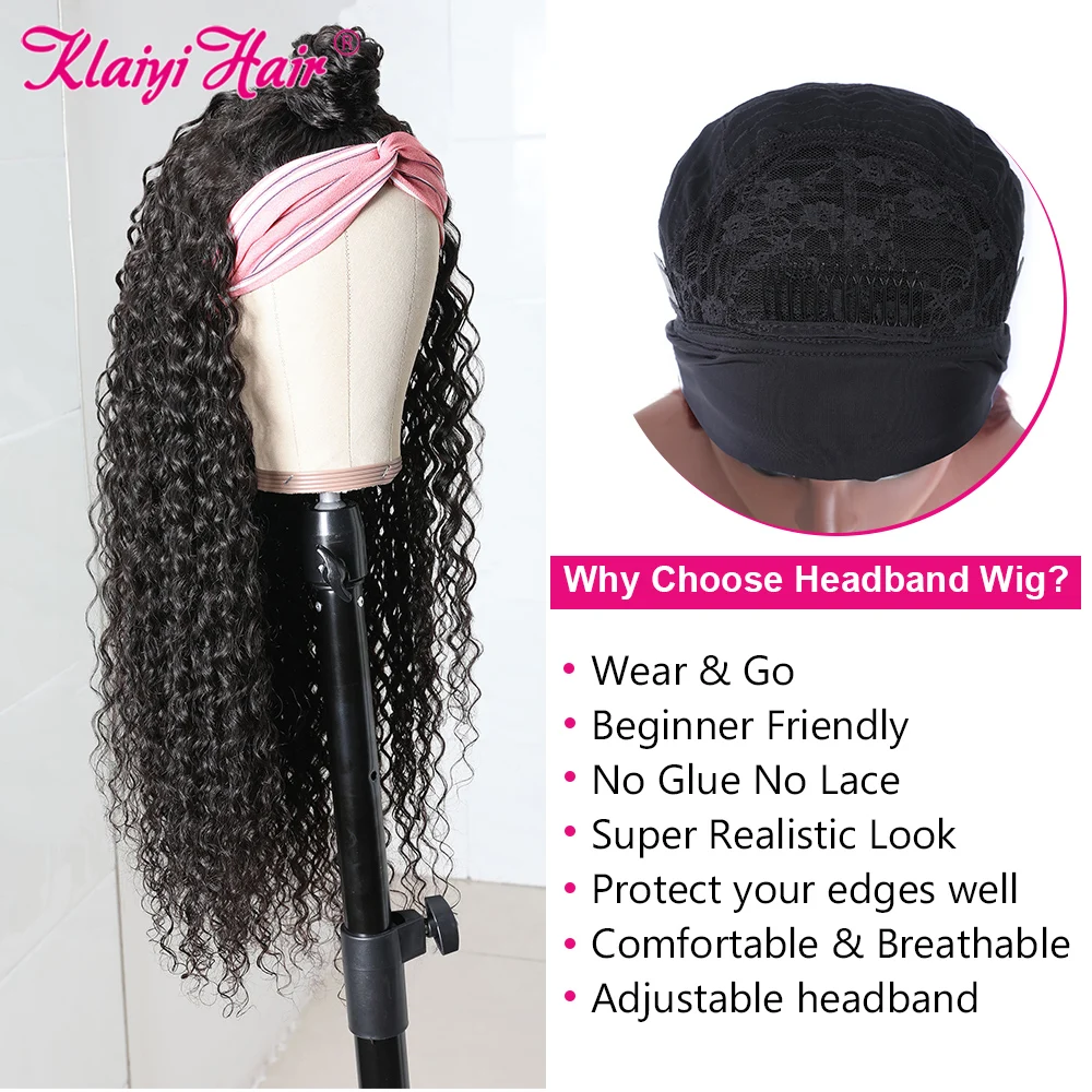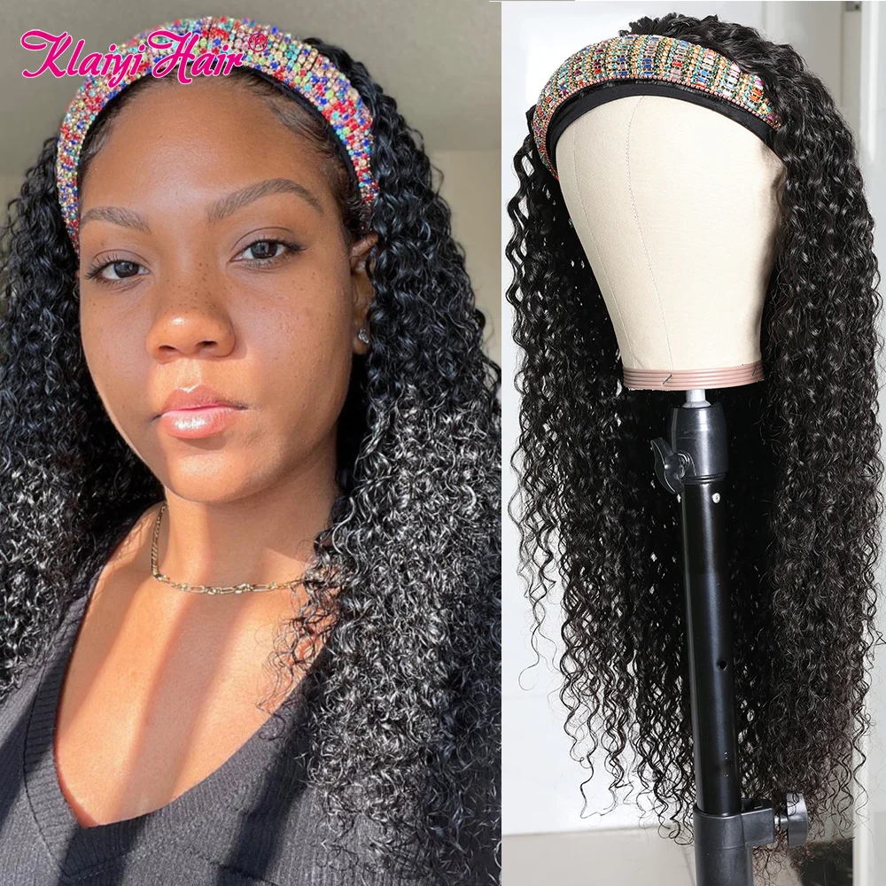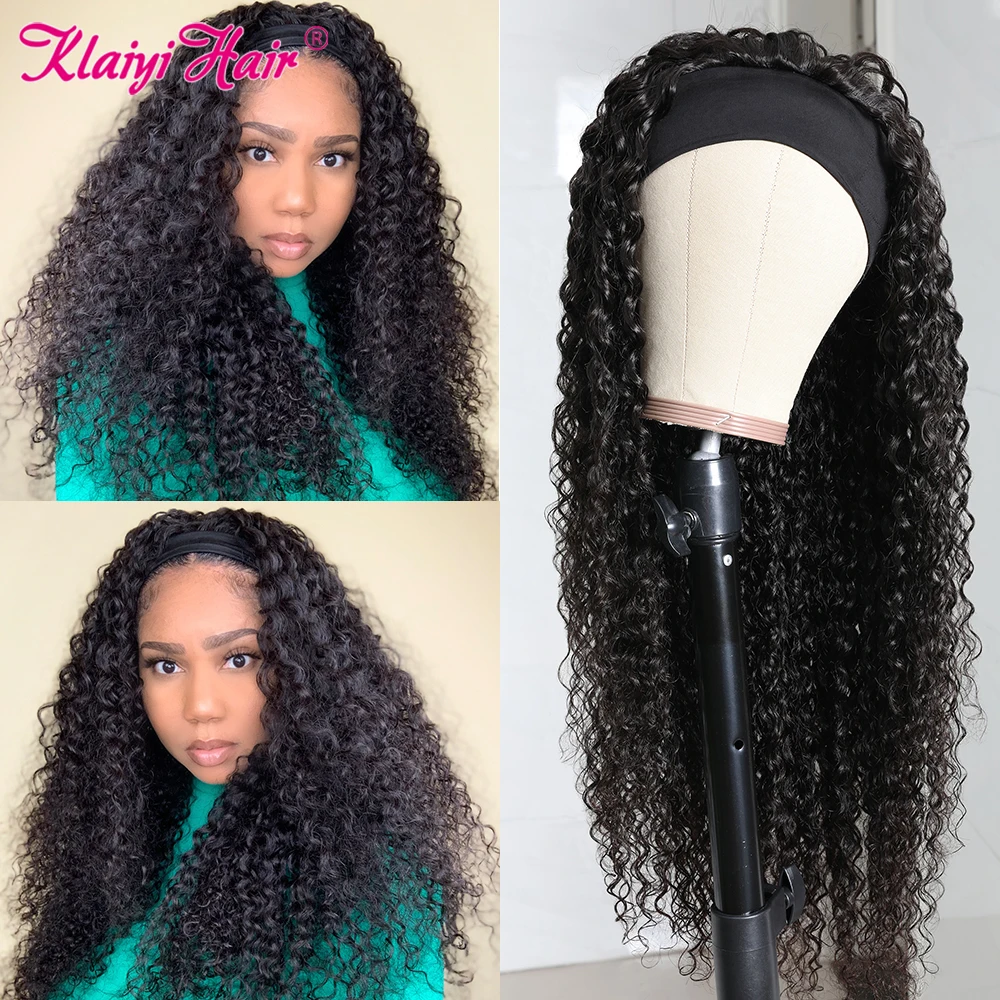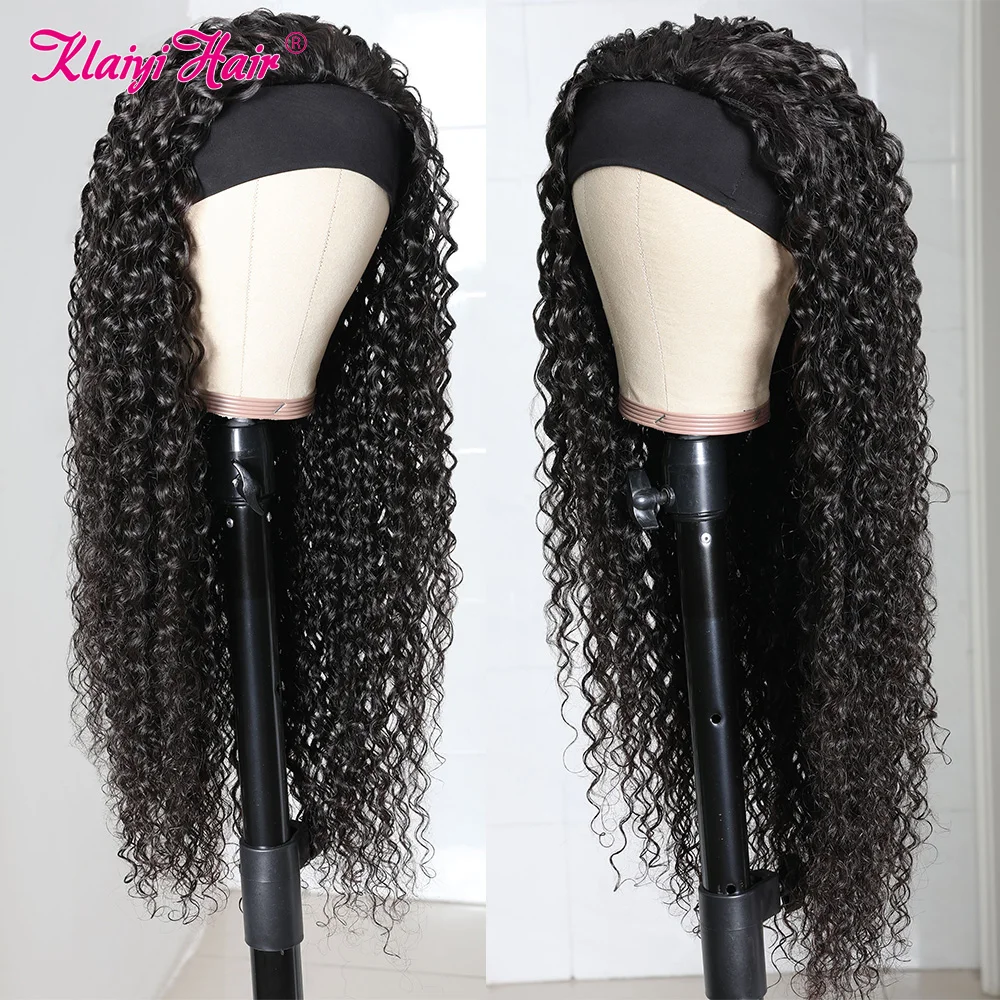 Klaiyi волосы длинные кудрявые парик с головной повязкой человеческие волосы бразильские волосы парики для женщин натуральные черные волосы Реми шарф кудрявый бесклеевой парик