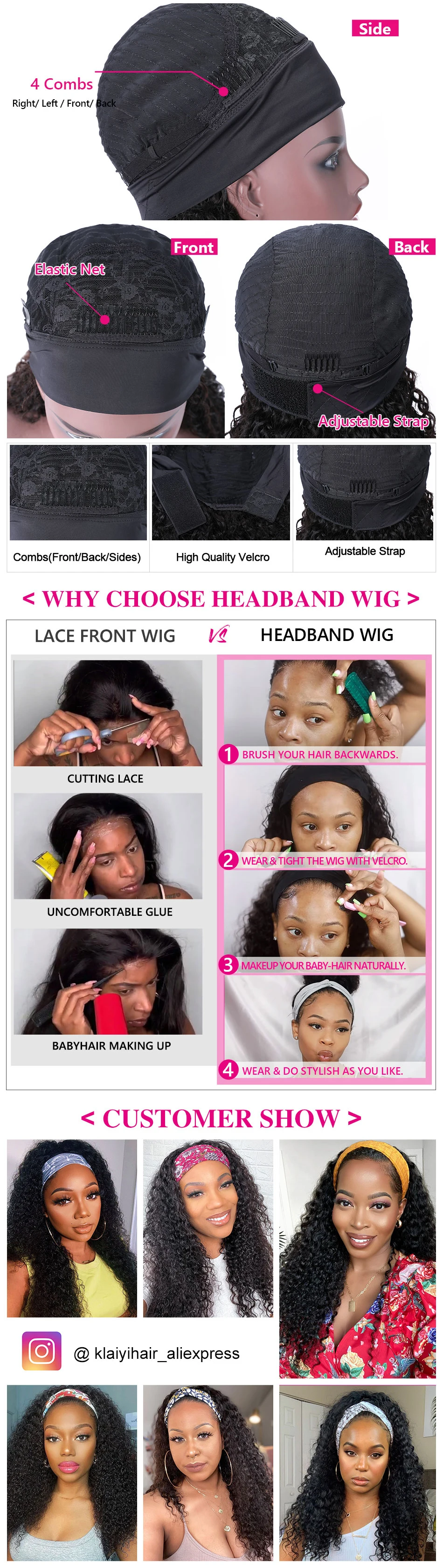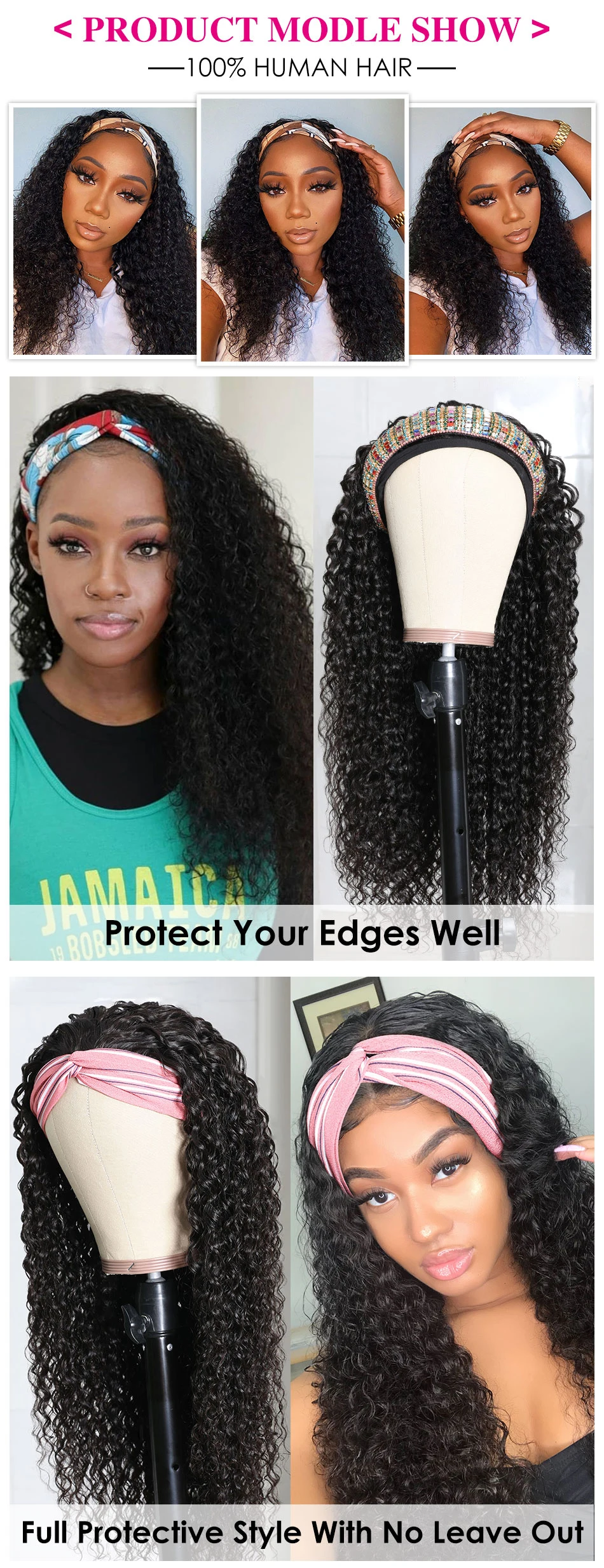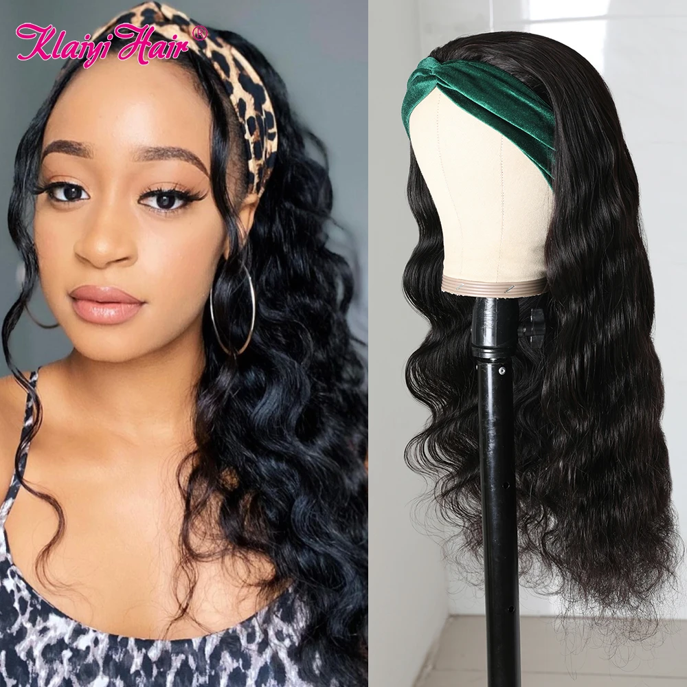 Klaiyi волосы длинные кудрявые парик с головной повязкой человеческие волосы бразильские волосы парики для женщин натуральные черные волосы Реми шарф кудрявый бесклеевой парик