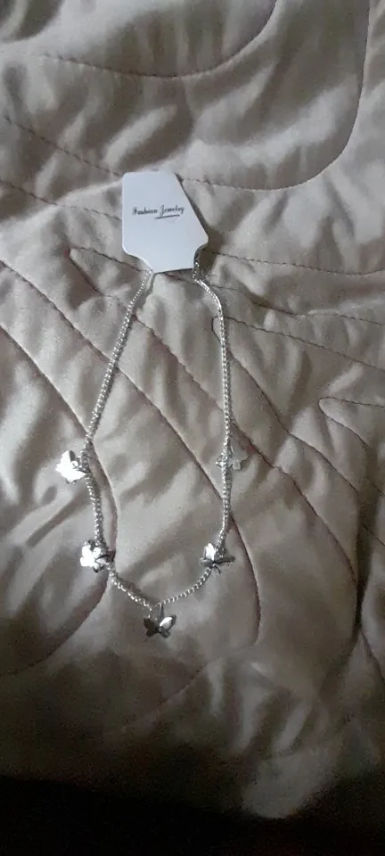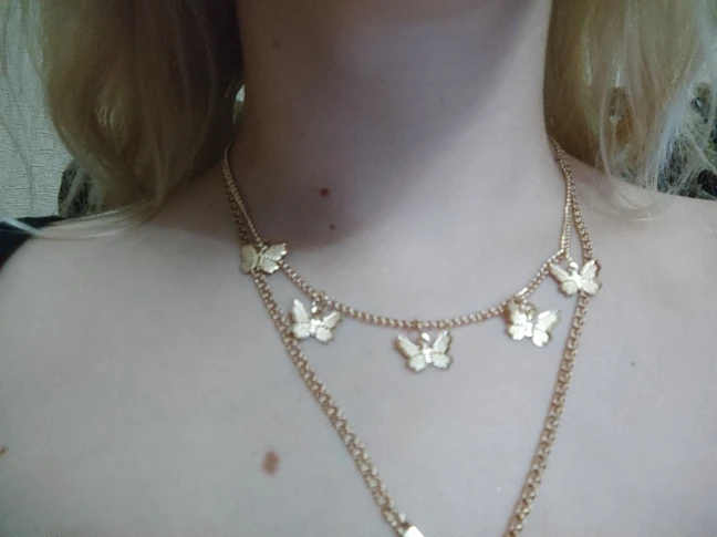 Точно к изображению. Немного длинный, не очень похож на колье, выглядит мило, потому что подвески в виде бабочек тонкие.