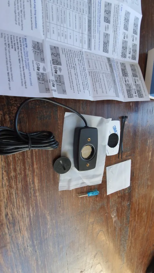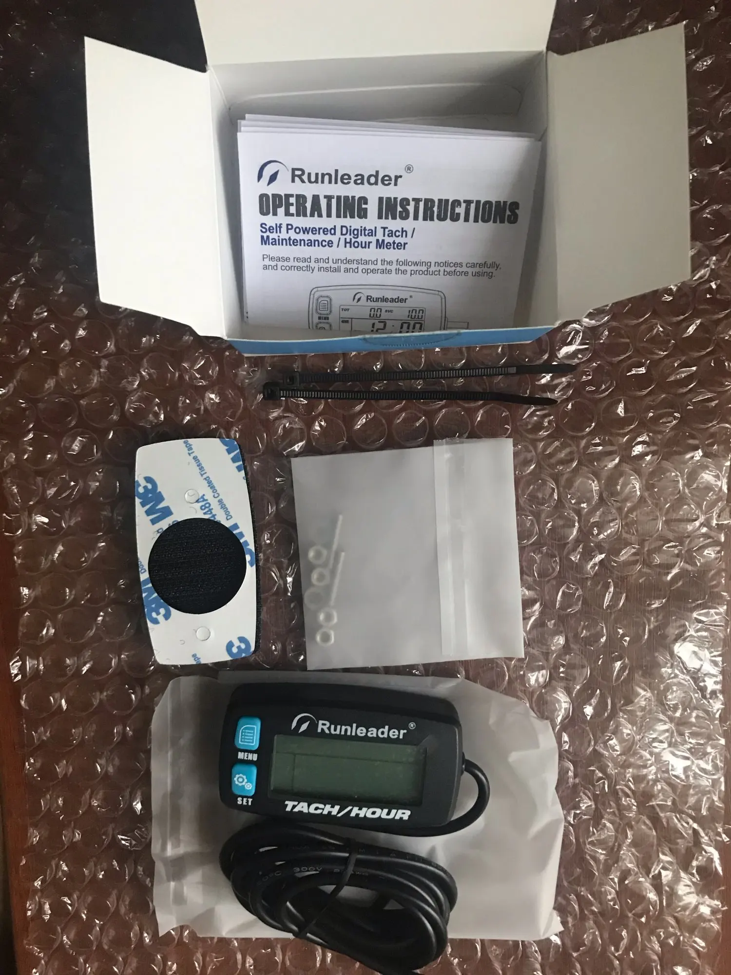 индуктивный тахометр сделан очень качественно, в комплекте батарейка, болтики, хомуты(страйк), липучка, длина провода 1.5 метра, инструкция на английском, упакован: заводская коробка завернутая в пупырчатую пленку и все это в коробке для пересылки, то есть упакован надёжно, продавец быстро отправил товар.
