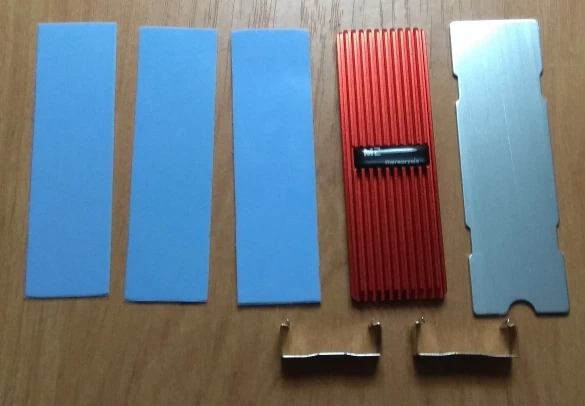 В комплекте две теплопроводных прокладки, алюминий достаточно толстый но из слота не выпирает - если над слотом видяха, то влезет без проблем