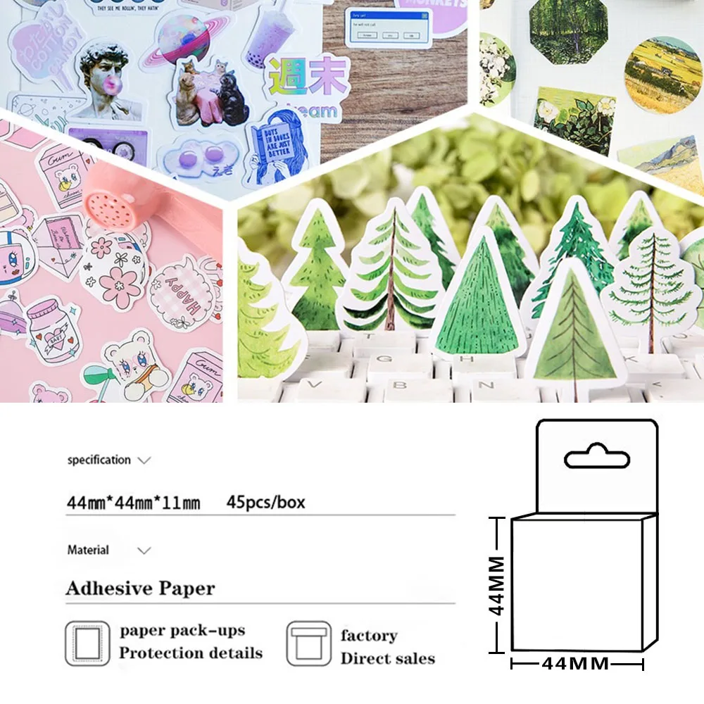 Название продукта: наклейкаМатериал: бумагаРазмер: 44*44*11 ммПосылка: бумажная коробкаКоличество: 45 шт./кор.Варианты использования: Скрапбукинг, дневник, альбом, сделай самВнимание:1. Пожалуйста, обратите внимание, что фото не показывает фактический размер, пожалуйста, обратитесь к описанию для получения информации о размере.2. Из-за разницы между различными мониторами изображение может не отражать фактический цвет изделия.