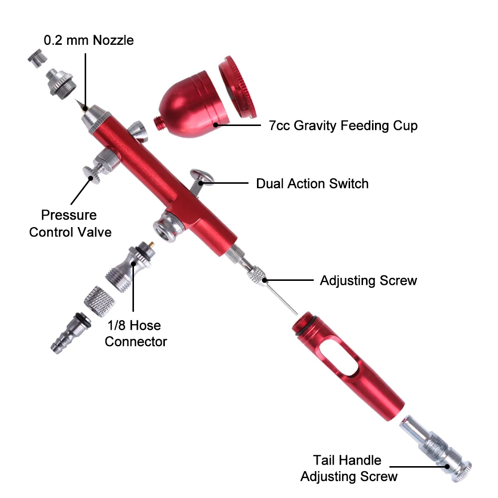 Высококачественная насадка, широкое распыление, триггер для легкого и точного распыления.Аэрограф Action gravity feed Для изобразительного искусства, нейл-арта, Временной Татуировки, украшения тортов, хобби и т. д.Цветная среда: водные красители, чернила и красители, акрил, автомобильные уретаны, Лаки, эмали (не входят в комплект).Изготовлен из высококачественного материала, удобен в использовании.Легкая заправка жидкости и Легкая очистка.Профессиональный набор аэрографов с гравитационной подачей для хобби, красок.Аэрограф для изготовления моделей, украшения тортов, рисования контуров камуфляжа, татуировки гвоздь искусства и т. д.Экономит гораздо больше времени, чем Рисование вручную, и отлично подходит для вашего дела с распылением.Конструкция триггера позволяет сохранить сырье и практичность.Широко используется любителями общих моделей.Есть два вида соединений, подходящих для многих видов компрессоров и распылителей, оснащенных одним маленьким ключом, одним красковым стаканом, одной соломинкой и одним воздухозаборником, на соломинку можно вдыхать краску или другие жидкости.