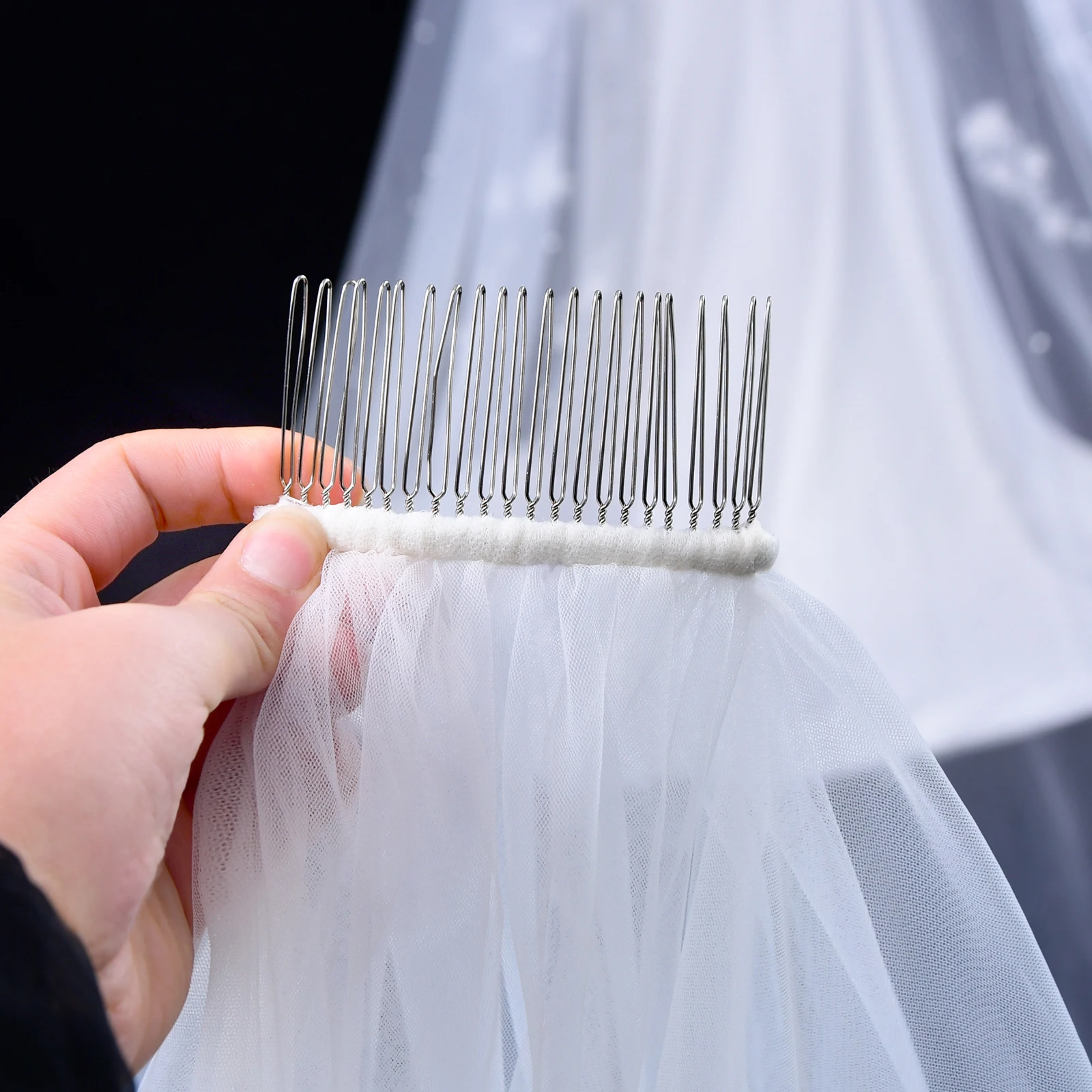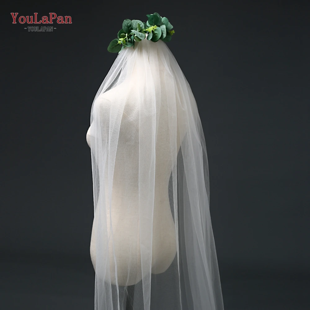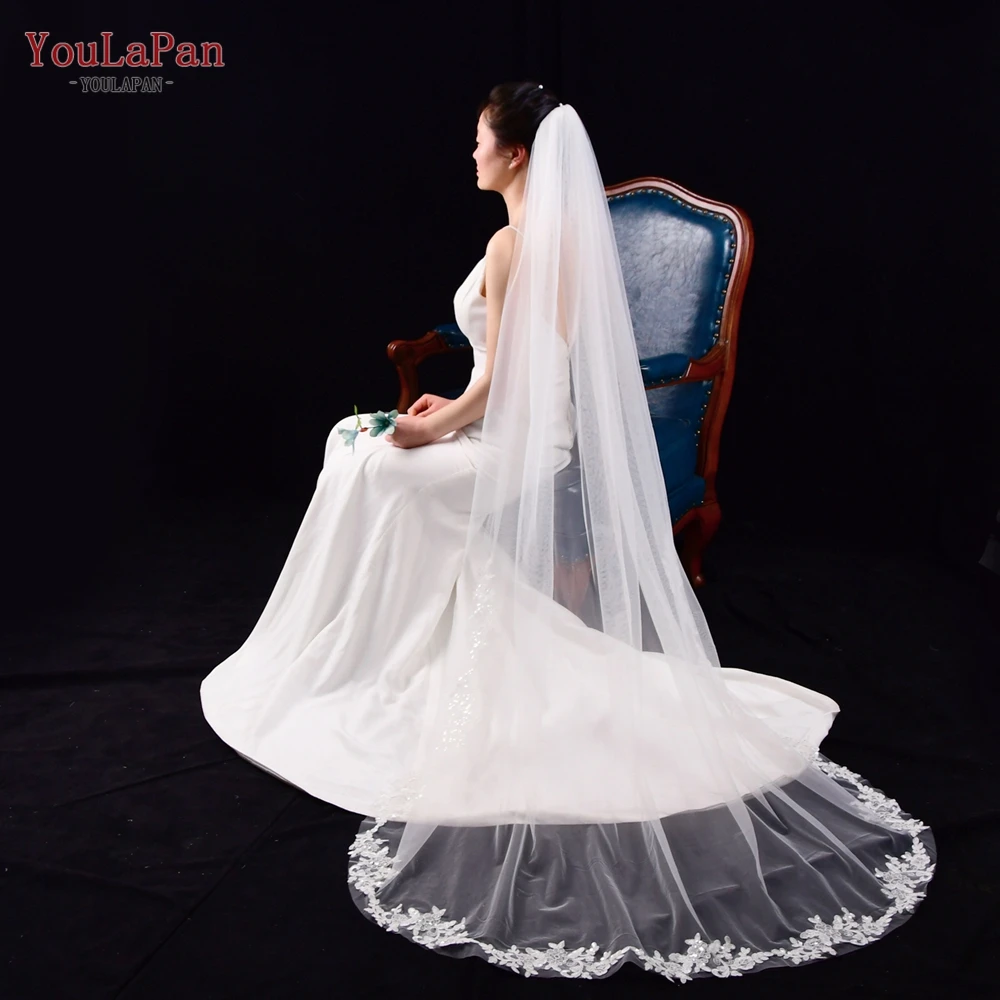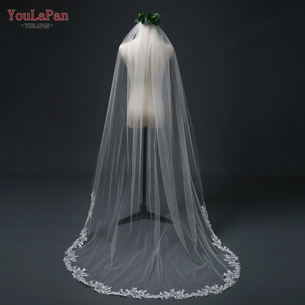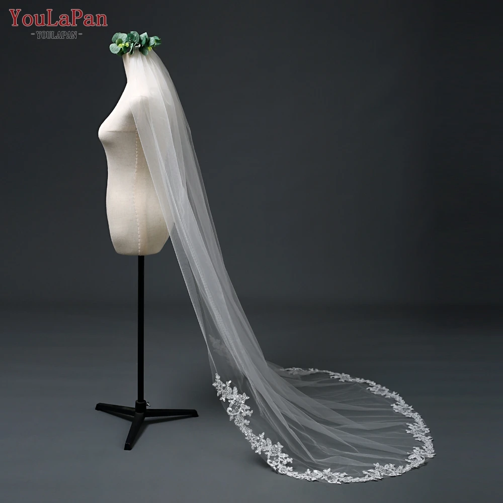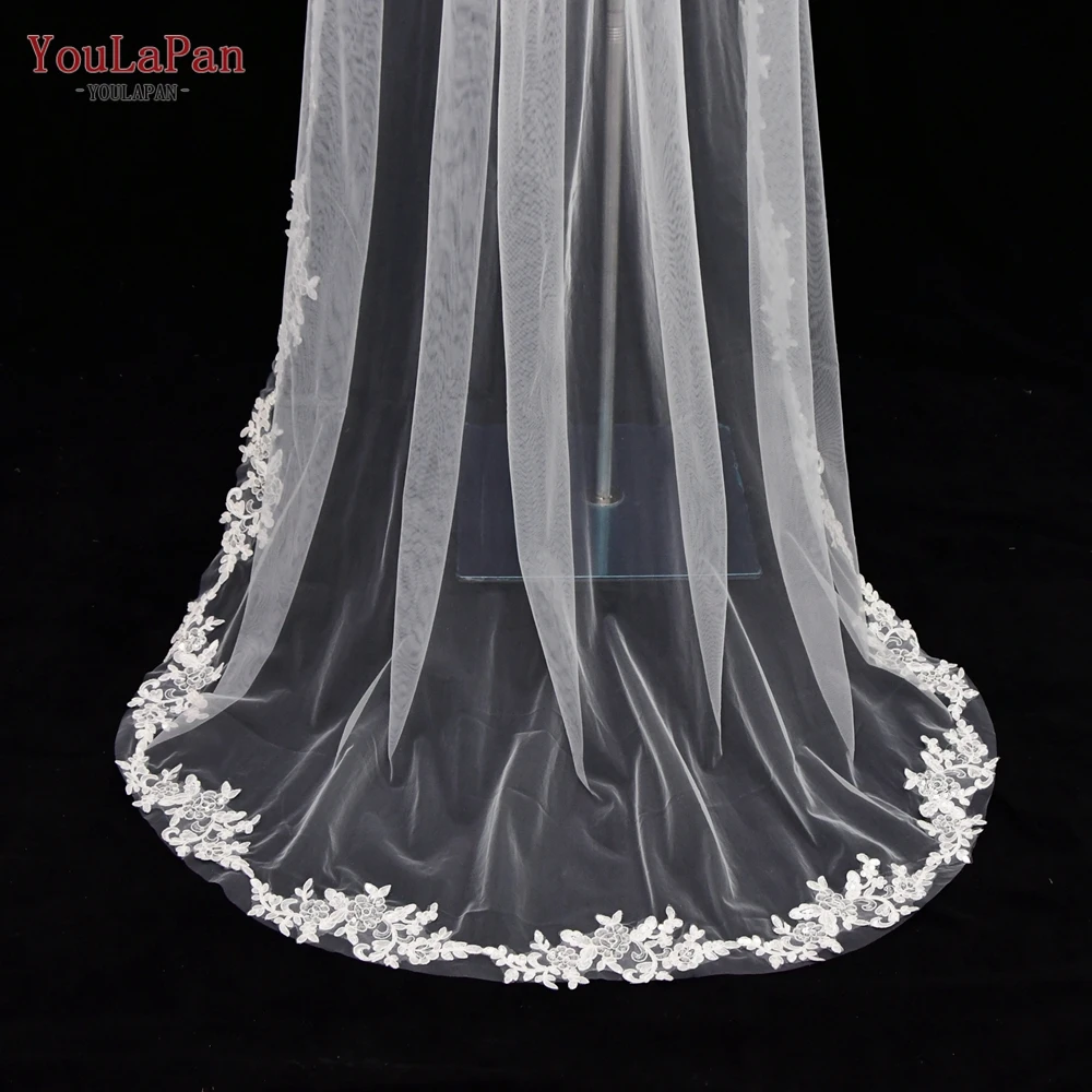 Фата YouLaPan V47, Длинная свадебная фата с кружевной аппликацией, ручной работы, белаяслоновая кость
