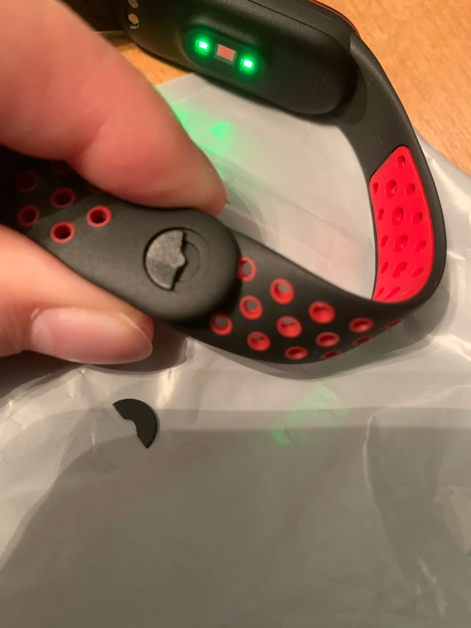 Продавец отправил быстро, доехало тоже оперативно. Так же быстро сломалась кнопка, в первый день!)). И на следующий день продавец сам согласовал возврат, за это ему респект. Короче все очень быстро))). Ремешок прикольно задуман и смотрится. Немного жесткий. Кнопку переставил с другого ремешка.