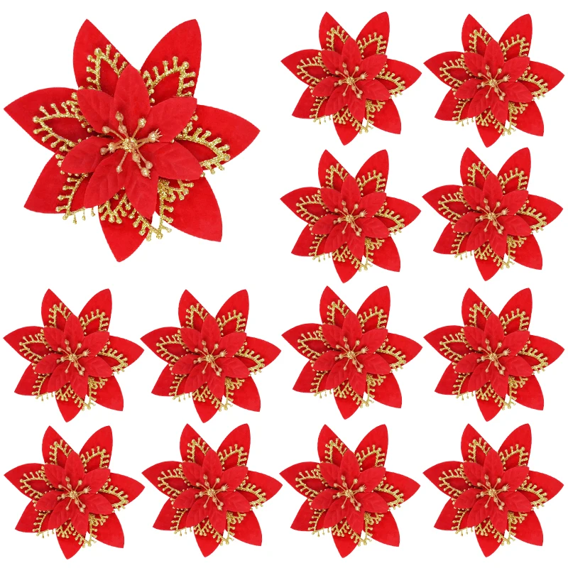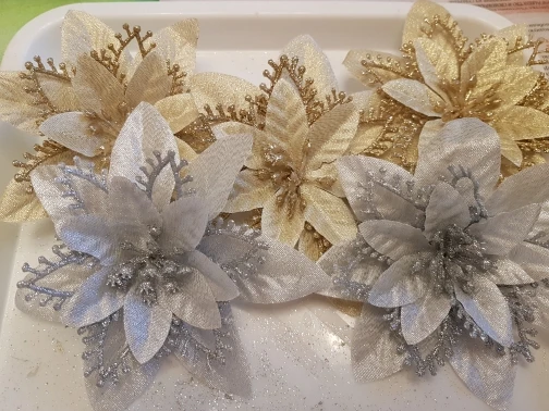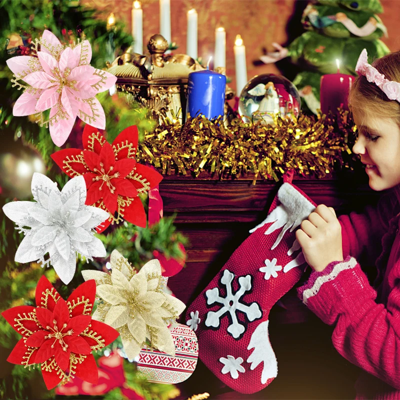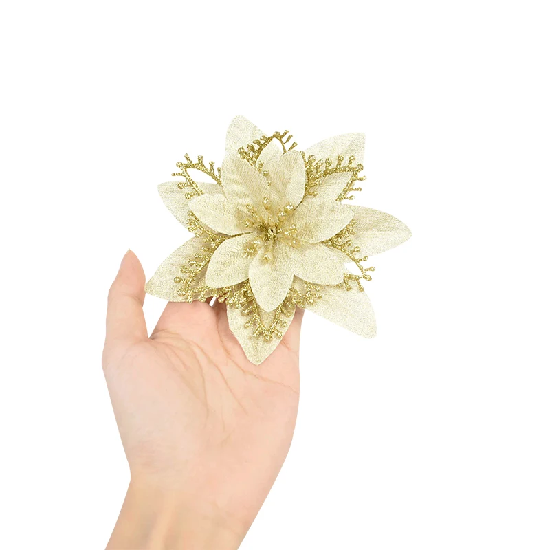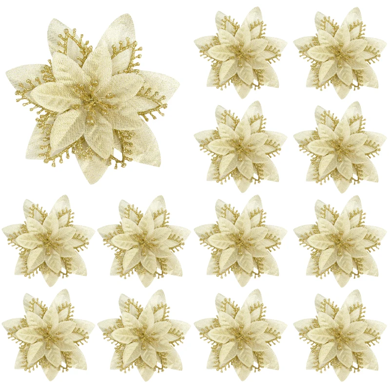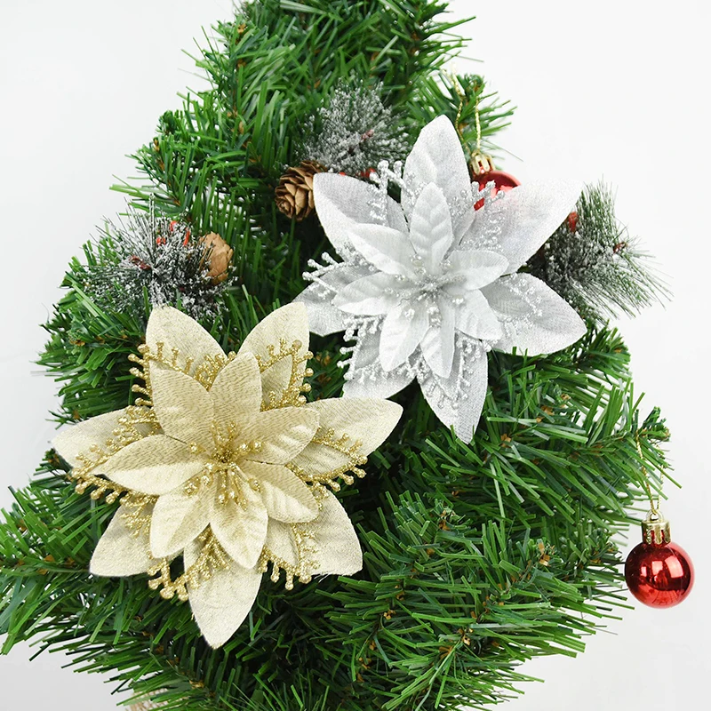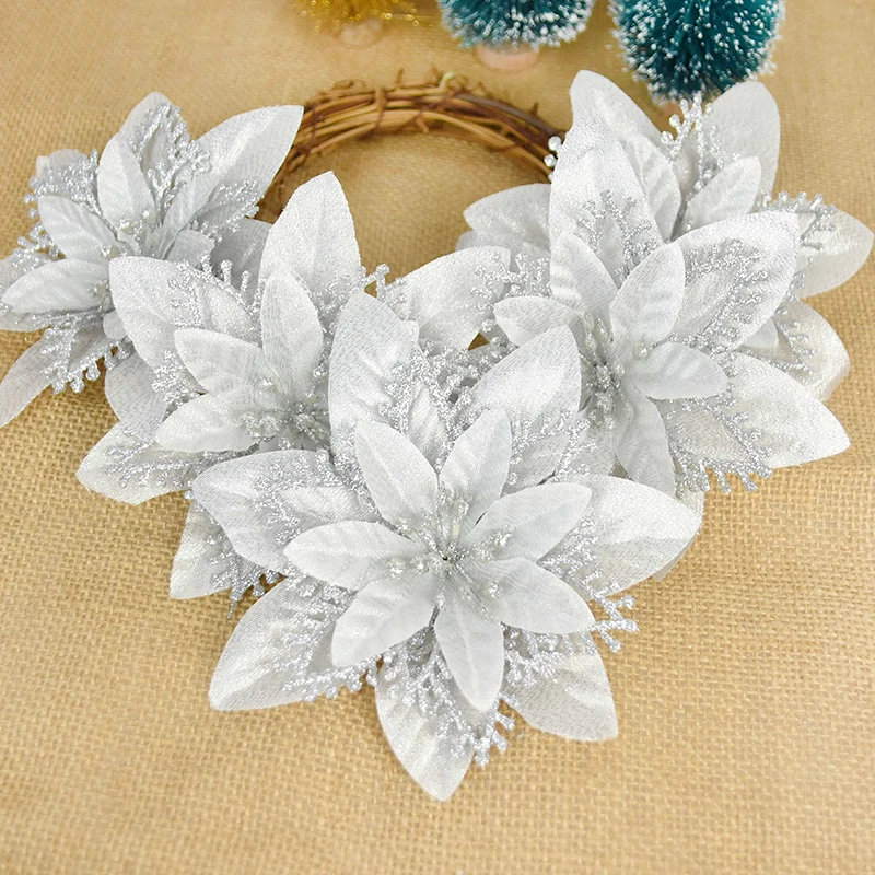 5 шт. 13 см, золотые и серебряные Искусственные Рождественские цветы, блестящие искусственные украшения для рождественской елки, украшение сделай сам для свадебной вечеринки