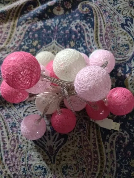 Цвет заказывала рандомный (дешевле). прислали 2 розовых. видимо розовый с белым самый не ходовой. Обе гирлянды работают. шарики целые.